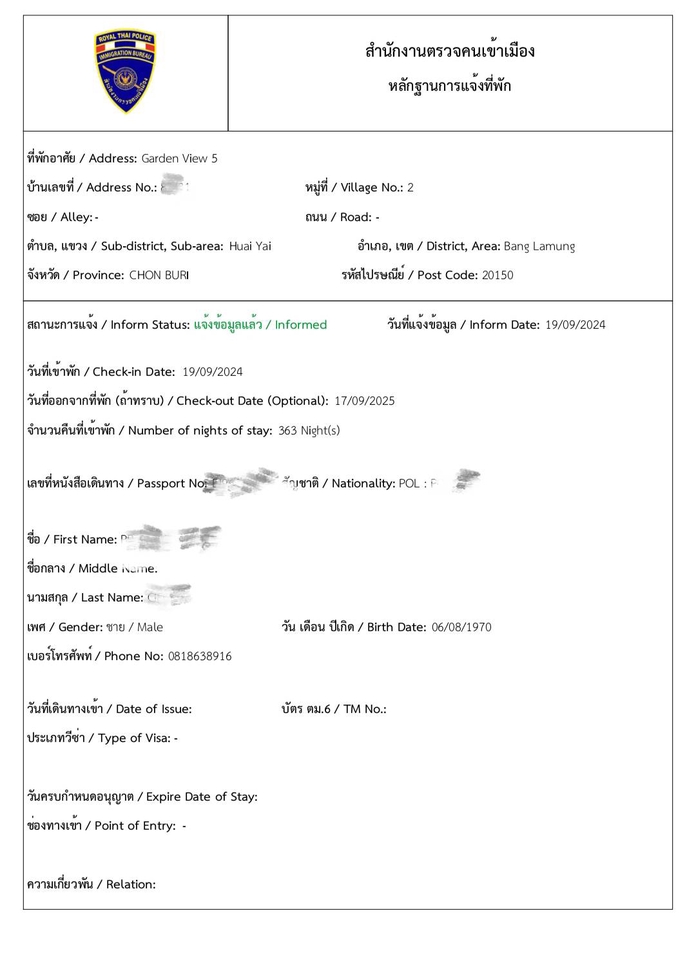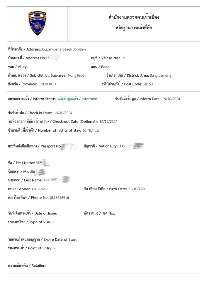 การให้บริการแจ้งที่พักอาศัย TM 30 (ตม30) เป็นการบริการที่ช่วยเจ้าของที่พักหรือผู้ให้เช่า ดำเนินการแจ้งข้อมูลที่พักของชาวต่างชาติที่เข้ามาพักอาศัยตามข้อบังคับของประเทศไทย เพื่อป้องกันการละเมิดกฎหมายการแจ้งที่พักอาศัย และเพื่อให้ลูกค้าได้รับความสะดวกในขั้นตอนนี้ ทีมงานจะช่วยดำเนินการทุกขั้นตอนตั้งแต่การเตรียมเอกสาร ตรวจสอบเอกสาร และแจ้งข้อมูลอย่างถูกต้อง ลดความยุ่งยาก และทำให้ลูกค้ามั่นใจได้ว่าการแจ้งที่พักอาศัยจะถูกดำเนินการตามข้อกำหนดของกฎหมาย ขั้นตอนการให้บริการ TM 30 1. รับข้อมูลและเอกสารจากลูกค้า ลูกค้าจะต้องส่งเอกสารที่จำเป็น เช่น สำเนาพาสปอร์ตหรือหน้าวีซ่า ของผู้เข้าพัก, สำเนาทะเบียนบ้านของที่พัก และบัตรประชาชนของเจ้าของที่พัก เป็นต้น 2. ตรวจสอบความครบถ้วนของเอกสาร ทีมงานจะทำการตรวจสอบเอกสารว่าครบถ้วนและถูกต้องตามข้อกำหนด หากพบว่ามีเอกสารที่ขาดหรือไม่ถูกต้อง ทีมงานจะติดต่อกลับเพื่อขอข้อมูลเพิ่มเติม 3. ดำเนินการแจ้งที่พักอาศัยในระบบออนไลน์ ทีมงานกรอกข้อมูลในระบบ TM 30 ออนไลน์อย่างละเอียดและแม่นยำ เพื่อส่งให้เจ้าหน้าที่ตรวจสอบและยืนยันการแจ้ง 4. ยืนยันการแจ้งและอัปเดตสถานะให้ลูกค้าทราบ เมื่อได้รับการยืนยันการแจ้งจากระบบแล้ว ทีมงานจะส่งหลักฐานยืนยันให้ลูกค้า พร้อมทั้งอัปเดตสถานะให้ทราบเป็นระยะ 5 ส่งหลักฐานการแจ้งที่พักที่ออกโดยสำนักงานตรวจคนเข้าเมือง ให้กับลูกค้า ขั้นตอนการทำงาน 1. รับข้อมูลและเอกสารจากลูกค้า ลูกค้าจะต้องส่งเอกสารที่จำเป็น เช่น สำเนาพาสปอร์ตหรือหน้าวีซ่า ของผู้เข้าพัก, สำเนาทะเบียนบ้านของที่พัก และบัตรประชาชนของเจ้าของที่พัก เป็นต้น 2. ตรวจสอบความครบถ้วนของเอกสาร ทีมงานจะทำการตรวจสอบเอกสารว่าครบถ้วนและถูกต้องตามข้อกำหนด หากพบว่ามีเอกสารที่ขาดหรือไม่ถูกต้อง ทีมงานจะติดต่อกลับเพื่อขอข้อมูลเพิ่มเติม 3. ดำเนินการแจ้งที่พักอาศัยในระบบออนไลน์ ทีมงานกรอกข้อมูลในระบบ TM 30 ออนไลน์อย่างละเอียดและแม่นยำ เพื่อส่งให้เจ้าหน้าที่ตรวจสอบและยืนยันการแจ้ง 4. ยืนยันการแจ้งและอัปเดตสถานะให้ลูกค้าทราบ เมื่อได้รับการยืนยันการแจ้งจากระบบแล้ว ทีมงานจะส่งหลักฐานยืนยันให้ลูกค้า พร้อมทั้งอัปเดตสถานะให้ทราบเป็นระยะ 5. ส่งหลักฐานการแจ้งที่พักที่ออกโดยสำนักงานตรวจคนเข้าเมือง ให้กับลูกค้า