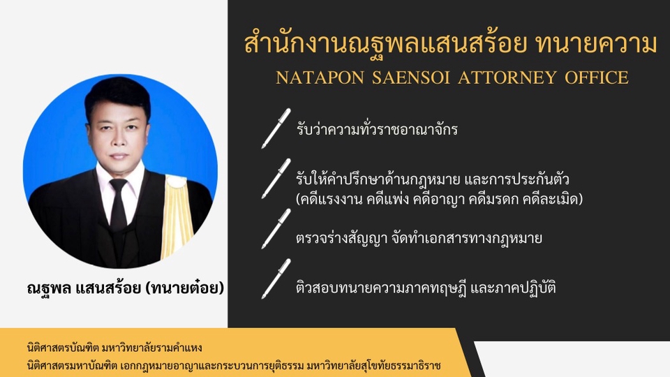 จัดทำเอกสารทางกฎหมาย เช่น หนังสือโนติส หนังสือรับสภาพหนี้ หนังสือมอบอำนาจ พินัยกรรม สัญญาต่างๆ