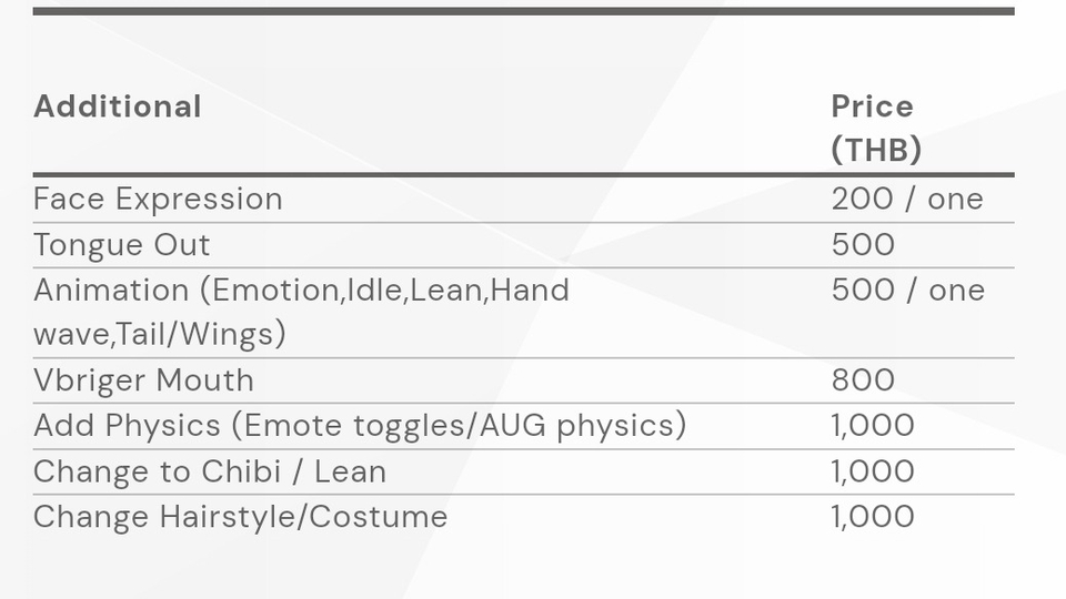 รับริก Model Vtuber (Rigging Vtuber) ด้วยโปรแกรมLive2D cubism ราคารวมเชิงพาณิชย์แล้ว ราคาขึ้นอยู่กับความละเอียดของโมเดล เพิ่ม option • เพิ่มสีหน้าละ +200฿ • Lean โน้มตัว +1,000฿ • Vbriger +800฿ • Animation +500฿ • อื่นๆรบกวนสอบถามเพิ่มเติม ______________ เงื่อนไข • ระยะเวลางาน 2-5 weeks ขึ้นอยู่กับความละเอียด สิ่งที่จะได้ • ไฟล์โมเดลพร้อมใช้งาน (.moc3) สิ่งที่ต้องเตรียม 1. ติดต่อคุยรายละเอียด 2. ไฟล์โมเดลคาเรคเตอร์ (.psd) แยกส่วนพร้อมริก ขั้นตอนการทำงาน 1. เตรียมไฟล์โมเดลแยกส่วนพร้อมริก (.psd) 2. ระบุงานริกที่ต้องการ - ริก ครึ่งตัว/เต็มตัว -ดีเทลเพิ่มเติม (เช่น ปีกขยับได้ , expression ที่อยากได้) 3. ทางเราจะประเมินราคาและระยะเวลาการส่งงาน