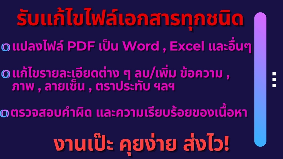 🧾แก้ไข/แปลงไฟล์ PDF → Word, JPG, PNG ฯลฯ 🧾รวม/แยกหน้า PDF ตามที่ต้องการ 🧾ลบ/เพิ่มหน้าใน PDF 🧾เพิ่มลายน้ำ / ลายเซ็น / เติมข้อความใน PDF 🧾ตรวจสอบคำผิด และความเรียบร้อยของเนื้อหา 🧾จัดหน้า/จัดรูปแบบเอกสารให้ดูเป็นทางการ 📌ตอบไว คุยง่าย เข้าใจงานเร็ว 📌เป็นเจ้าหน้าที่ไอที มีประสบการณ์ดูแลเอกสารจริง 📌ตั้งใจและใส่ใจกับทุกไฟล์ งานเรียบร้อยก่อนส่งเสมอ 📌พร้อมปรับแก้ให้จนกว่าคุณจะพอใจ 🌟ผมสามารถรับงานอื่นนอกเหนือจากนี้ได้เช่นกัน ส่งรายละเอียดมาคุยกันก่อนได้ครับ 🌟หากเอกสารมีความลับ ผมยินดีรักษาความเป็นส่วนตัวให้ 100%