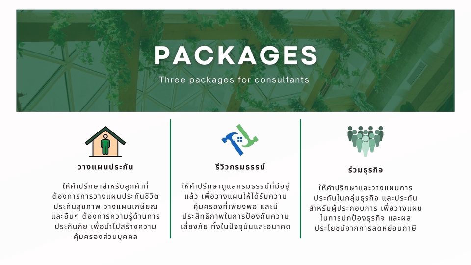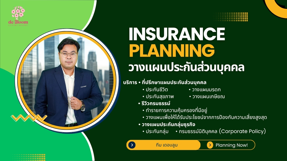 บริการที่ปรึกษาและวางแผนประกันชีวิต ประกันสุขภาพ การวางแผนส่งต่อมรดก กองทุนสำหรับเกษียณอายุ รับรีวิวกรมธรรม์ เพื่อให้ได้รับประโยชน์สูงสุดจากความคุ้มครอง และทำให้เข้าใจง่าย บริการที่ปรึกษาประกันกลุ่ม และกรมธรรม์นิติบุคคล