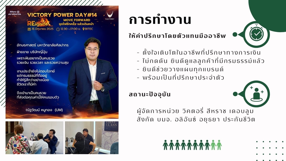 ปัจจุบันเป็นผู้บริหารตัวแทนประกันชีวิต มืออาชีพ ของ Allianz Ayudhya ที่ปรึกษาด้านการประกันชีวิต และความเสี่ยง - แผนประกันชีวิต - แผนประกันสุขภาพ - วางแผนทางการเงิน และส่งต่อมรดก ประสบการณ์จากการเดินทาง ทั้งในเอเชีย ยุโรป และอเมริกา ทั้งการเดินทางท่องเที่ยว และเดินทางเพื่อธุรกิจ มีทักษะด้านการบริหารจัดการ - สามารถออกแบบแผนการท่องเที่ยว - เป็นที่ปรึกษาเรื่องวีซ่า และที่ปรึกษาเรื่องการเดินทาง