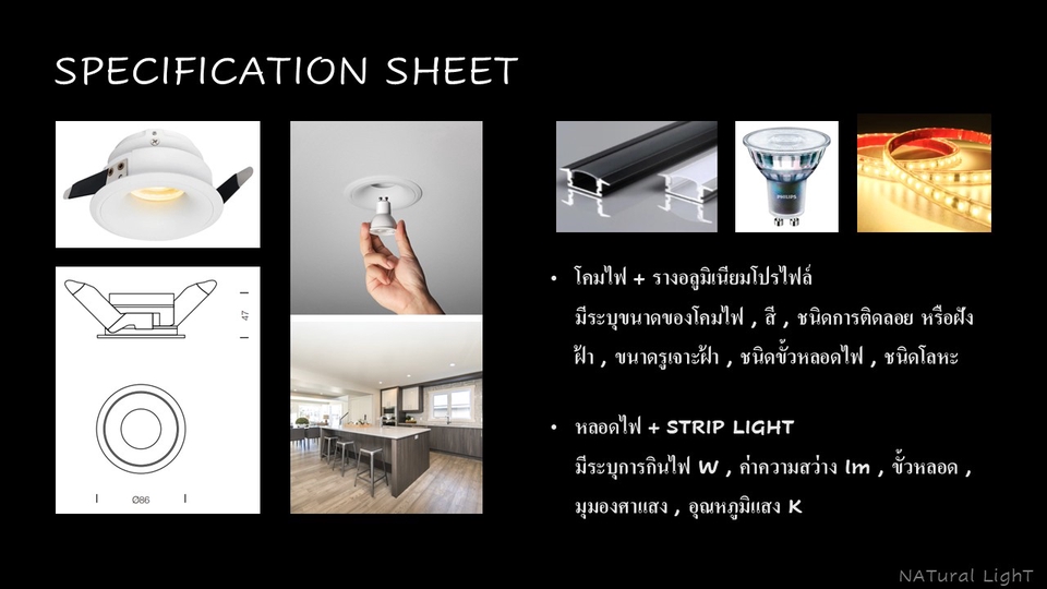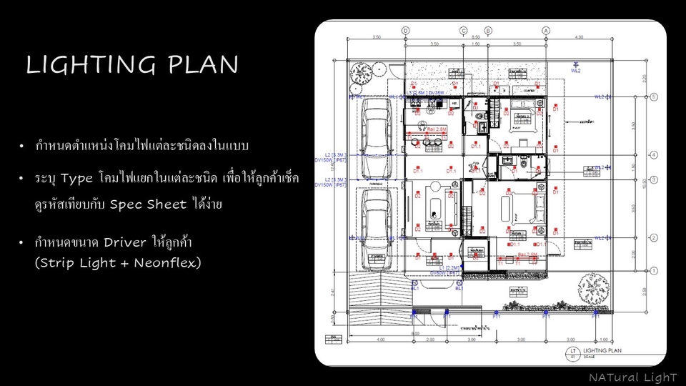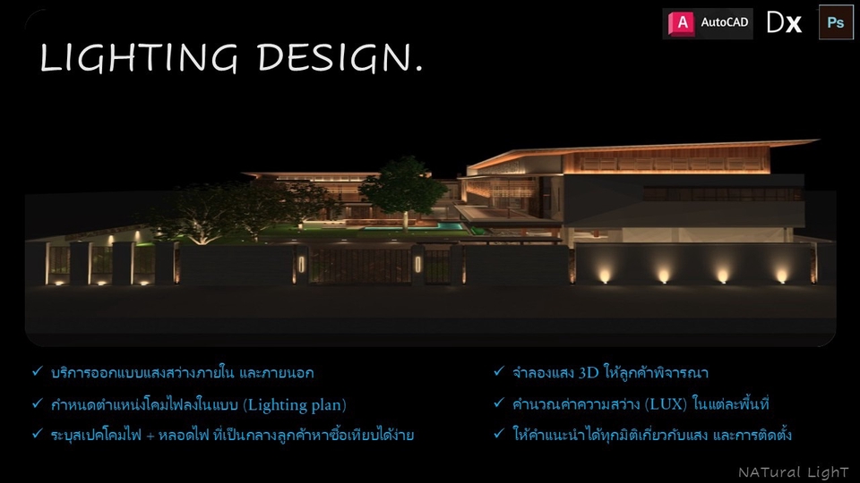 ออกแบบตามหลักวิศวกรรมโดยวิศวกรผู้เชี่ยวชาญมีใบประกอบวิชาชีพ ผสมผสานความสวยงาม และฟังก์ชันการใช้งานอย่างลงตัว 1. ออกแบบตาม Mood & Tone หรือ Reference ที่ลูกค้าต้องการเป็นหลัก!! (หากแต่มีส่วนไหนขาดตกบกพร่อง หรือไม่เหมาะสม หรือบางพื้นที่จำเป็นต้องอิงค์ค่าความสว่างตามมาตรฐาน เราพร้อมให้คำแนะนำตามหลักวิศวกรรม) 2. เลือกลง Spec โคมไฟต่างๆแบบเป็นกลาง ลูกค้าสามารถหาซื้อได้ทั่วไป 3. ภาพ 3D Presentation ที่จะจัดส่งให้ลูกค้า ไม่ใช่การใช้ Photoshop แต่งภาพทั้งสิ้น แต่เราใช้ IES FILE ของโคมไฟ+หลอดไฟ+ค่าความสว่าง lumen ที่ตรงตามจริง แสงที่ออกมาเมื่อติดตั้งโคมไฟ+หลอดจะได้ผลตาม 3D Presentation ที่จัดส่งให้ลูกค้า 4. เราดูแลลูกค้าดีแน่นอน เพราะเราต้องการลูกค้าประจำ การันตีผลงานมากกว่า 800 โครงการ และเป็น Lighting Designer มากกว่า 15 ปี ข้อมูลที่ต้องการจากลูกค้า 1. ไฟล์ Cad มีตำแหน่งเฟอร์นิเจอร์ + ชื่อห้อง + ความสูงฝ้า 2. Sketchup Model สำหรับงานที่ลูกค้าต้องการ 3D แบบละเอียดๆเสมือนจริง 3. Mood & Tone หรือ Reference ที่ต้องการ 4. ข้อมูลผู้อยู่อาศัยเช่น วัยอายุ , ความชอบแสงสีในแบบส่วนตัว , สิ่งที่ต้องการเน้น ขั้นตอนการทำงาน 1. บรีฟงาน แจ้งความต้องการของลูกค้า 2. ทำงานตามแพ็คเกจมราลูกค้าเลือก 3. ส่งมอบงาน 4. นัดชี้แจงรายละเอียดแบบ+Spec โคมไฟต่างๆ นอกเหนือจากแพ็คเกจที่แจ้งรับงาน คิดค่าใช่จ่ายตามที่ตกลงกันก่อนเริ่มดำเนินการ - Site Survey - วัด Lux หน้างาน ถ่ายรูปออกเอกสารการวัด Lux (Lux meter) - ออกแบบวงจรไฟแสงสว่าง เต้ารับ จัดทำตารางโหลดไฟ+เบรกเกอร์+ท่อร้อยสายไฟ พร้อมเซ็นแบบวิศวกรรมไฟฟ้า NATural Light - แสงธรรมชาติ แสงที่จริงใจ และแสงที่ไว้วางใจได้