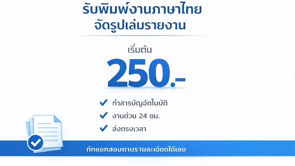 ให้บริการพิมพ์งานภาษาไทยจากไฟล์ลายมือ รูปภาพ หรือ PDF พร้อมจัดรูปแบบรายงานอย่างเป็นระเบียบตามมาตรฐานการศึกษา เหมาะสำหรับนักเรียน นักศึกษา และผู้ที่ต้องการจัดเอกสารให้เรียบร้อย สวยงาม พร้อมส่งอาจารย์หรือหน่วยงาน สิ่งที่คุณจะได้รับจากบริการนี้ : ✔ พิมพ์งานครบถ้วนตามต้นฉบับ ✔ จัดรูปแบบหน้ากระดาษ ระยะขอบ ฟอนต์ และขนาดตัวอักษรอย่างเหมาะสม ✔ ทำสารบัญอัตโนมัติในระบบ Word ✔ จัดเรียงหัวข้อและลำดับเนื้อหาอย่างถูกต้อง ✔ ตรวจความเรียบร้อยก่อนส่งทุกครั้ง เรามุ่งเน้นความถูกต้อง ความตรงต่อเวลา และการสื่อสารที่ชัดเจนกับลูกค้าในทุกขั้นตอน ➕ บริการเสริม (Add-on) • เพิ่มหน้าละ 15 บาท • งานด่วนภายใน 24 ชม. +300 บาท • งานด่วนภายใน 12 ชม. +450 บาท • ตรวจคำผิดละเอียด +200 บาท • จัดทำ PowerPoint จากรายงาน เริ่มต้น 300 บาท 📌 เงื่อนไขการให้บริการ ✔ กรุณาส่งตัวอย่างงานก่อนกดสั่งซื้อ เพื่อประเมินราคาอย่างเหมาะสม ✔ งานด่วนกรุณาแจ้งล่วงหน้า ✔ การแก้ไขเพิ่มเติมนอกเหนือขอบเขต อาจมีค่าใช้จ่ายเพิ่มเติม ✔ เริ่มดำเนินงานหลังจากยืนยันคำสั่งซื้อเรียบร้อย