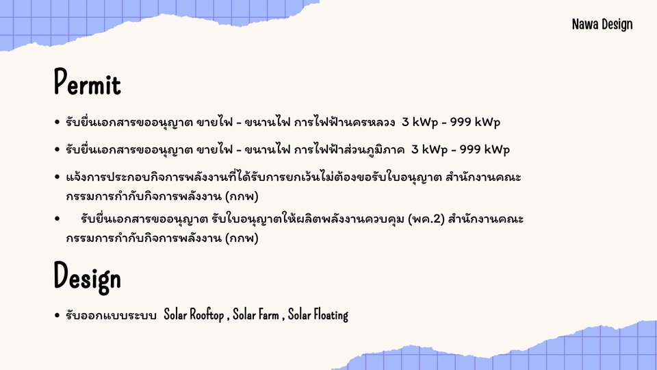 รับยื่นเอกสารขออนุญาตหน่วยงาน การไฟฟ้านครหลวง/การไฟฟ้าส่วนภูมิภาค/สำนักงานคณะกรรมการกำกับกิจการพลังงาน (กกพ)/สำหรับบ้านที่ติดตั้งโซลาร์เซลล์ด้วยตัวเองและยังไม่ได้ยื่นเอกสารให้ถูกต้องตามกฏหมาย รับออกแบบระบบโซลาร์เซลล์โดยวิศวกรไฟฟ้าที่ได้รับใบอนุญาตประกอบวิชาชีพจาก สภาวิศวกร ขั้นตอนการทำงาน 1. จัดเตรียมเอกสารที่ใช้ในการยื่นขออนุญาต 2. ยื่น ขายไฟ-ขนานไฟ การไฟฟ้า 3. ยื่นประกอบกิจการพลังงานที่ได้รับการยกเว้นไม่ต้องขอรับใบอนุญาตผ่านระบบของ กกพ 4. เข้าไป ชำระเงิน-เซ็นสัญญา(ขายไฟ) กับการไฟฟ้า เมื่อเอกสารผ่านการอนุมัติแล้ว