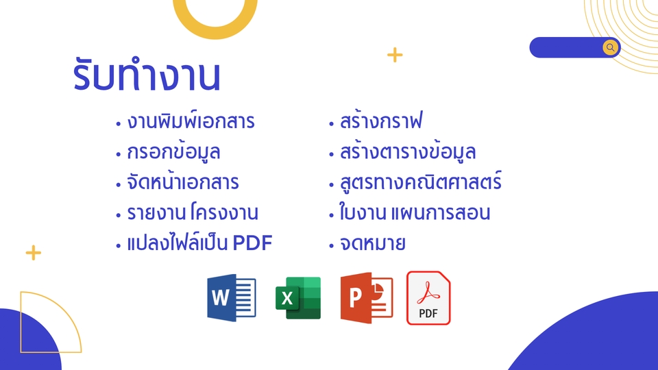 รับทำงานเอกสารต่างๆในโปรแกรม Microsoft Office (Word,Excel,PowerPoint) ทั้งภาษาไทยและภาษาอังกฤษ ไม่ว่าจะเป็น 📌งานพิมพ์เอกสาร 📌กรอกข้อมูล 📌จัดหน้าเอกสาร 📌รายงาน โครงงาน 📌แปลงไฟล์เป็น PDF หรือ Word 📌 สร้างกราฟ 📌สร้างตารางข้อมูล 📌สูตรทางคณิตศาสตร์ 📌ใบงาน แผนการสอน 📌จดหมาย และอื่นๆอีกมากมาย แจ้งรายละเอียดที่ต้องการ ได้แก่ ข้อมูลเนื้อหา ไฟล์งานที่ต้องการ(.pdf .jpg .png .xlsx .docx .pptx) หากเป็นงานกรอกข้อมูล ให้ส่งมาเป็นไฟล์ Word หรือ Excel ตกลงเรื่องราคาและวันเวลาส่งงาน เมื่อตกลงราคา วันเวลาส่งาน และชำระเงินได้แล้ว จะเริ่มทำงานโดยทันที จะส่งดราฟให้ลูกค้าเป็นระยะ ลูกค้าสามารถ ให้ปรับแก้ไขงานได้ตามแพ็คเกจที่เลือกไว้ ส่งงานฉบับเสร็จสมบูรณ์ให้ลูกค้า ปิดงานและสามารถรีวิวการบริการของเราได้เลย