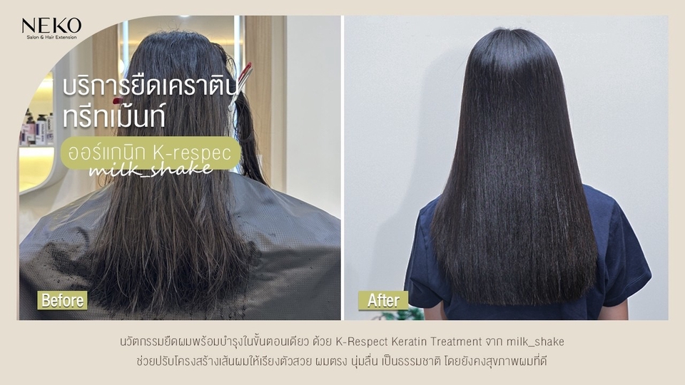 นวัตกรรมยืดผมพร้อมบำรุงในขั้นตอนเดียว ด้วย K-Respect Keratin Treatment จาก milk_shake ช่วยปรับโครงสร้างเส้นผมให้เรียงตัวสวย ผมตรง นุ่มลื่น เป็นธรรมชาติ โดยยังคงสุขภาพผมที่ดี ✅สูตร ออแกนิค ปราศจากฟอร์มาลดีไฮด์ อ่อนโยนต่อเส้นผมและหนังศีรษะ ✅ช่วย คลายลอน ลดชี้ฟู โดยไม่ทำให้ผมแข็งทื่อ ✅ผมดูตรง เรียบ เงางาม มีน้ำหนัก เป็นธรรมชาติ ✅เติมเต็ม เคราติน ช่วยฟื้นฟูผมแห้งเสียจากการทำเคมี ✅ลดเวลาการจัดทรง ผมดูเรียบร้อยแม้ไม่ไดร์ ✅เหมาะสำหรับผมทำสี ผมผ่านเคมี หรือผมแห้งเสีย ✅เหมาะสำหรับผู้ที่ต้องการผมตรงธรรมชาติ ไม่เน้นตรงแข็ง ✅เหมาะสำหรับคนที่มีผมชี้ฟู จัดทรงยาก 📌 ผลลัพธ์ขึ้นอยู่กับสภาพเส้นผมเดิม 📌 บริการนี้เน้นความตรงแบบธรรมชาติ ไม่ใช่การยืดถาวร