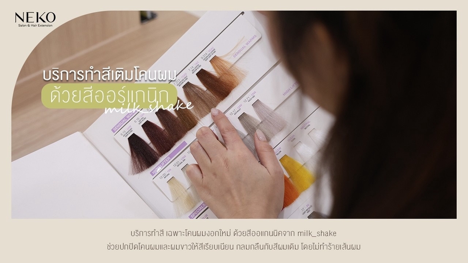 บริการทำสี เฉพาะโคนผมงอกใหม่ ด้วยสีออแกนนิคจาก milk_shake ช่วยปกปิดโคนผมและผมขาวให้สีเรียบเนียน กลมกลืนกับสีผมเดิม โดยไม่ทำร้ายเส้นผม ✅ แอมโมเนียต่ำ ลดการระคายเคือง กลิ่นไม่ฉุน อ่อนโยนต่อหนังศีรษะ ✅ เฉดสีหลากหลาย ครอบคลุมตั้งแต่โทนธรรมชาติ แฟชั่น ไปจนถึงสีสุภาพสำหรับลุคทำงาน ✅ สีติดสวยสม่ำเสมอ เม็ดสีคุณภาพสูง ช่วยให้สีดูเงางาม มีมิติ ✅ สีไม่ซีดเร็ว สีติดทนนานกว่าสีทั่วไป ผมยังดูสวยแม้ผ่านการสระหลายครั้ง ✅ ดีต่อเส้นผม ช่วยคงความชุ่มชื้น ลดความแห้งเสียหลังทำสี ✅ เหมาะสำหรับผู้ที่ต้องการทำสีผมเป็นประจำ หรือผู้ที่กังวลเรื่องผมเสีย ✅ เหมาะสำหรับผู้ที่แพ้ง่าย หรือไม่ชอบกลิ่นแอมโมเนียแรง 📌 ผลลัพธ์สีอาจแตกต่างตามสภาพเส้นผมเดิมและประวัติการทำเคมี