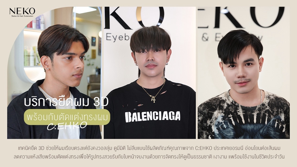 เริ่มจากการวิเคราะห์สภาพเส้นผมและรูปทรงศีรษะ ออกแบบและ ตัดผมให้เข้ากับโครงหน้า เพื่อวางโครงสร้างทรงก่อนทำเคมี จากนั้นทำการยืดวอลลุ่ม 3D สำหรับผู้ที่มีผมหยิกหรือหยักศกและต้องการให้ผมดูตรงขึ้นแบบธรรมชาติ ไม่ลีบแบนจนเกินไป เทคนิคนี้จะช่วยคลายลอน ลดความฟู พร้อมคงวอลุ่มบริเวณโคนผม ทำให้ทรงดูมีมิติ ไม่แบนติดหนังศีรษะ ได้ลุคเรียบร้อย ดูสะอาด และทันสมัย เซ็ตง่ายในชีวิตประจำวัน เพียงไดร์จัดทรงเล็กน้อยก็ได้ลุคสไตล์เกาหลี เราเลือกใช้ผลิตภัณฑ์จาก C:EHKO ประเทศเยอรมนี ซึ่งช่วยลดความแห้งเสียของเส้นผมเมื่อเทียบกับน้ำยาทั่วไป ทำให้ผมนุ่ม เงางาม และดูเป็นธรรมชาติหลังการยืด