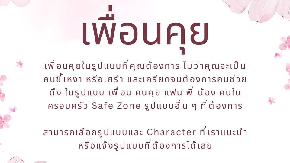 เพราะเรารู้ดีว่าการไม่มีใครในวันที่แย่มันผ่านไปได้ยากขนาดไหน และเราก็ผ่านวันเลวร้ายแบบนั้นมาได้เพราะมีคนที่รับฟังและพร้อมเข้าใจเป็นเพื่อน เราจึงขอส่งมอบบริการนี้ให้คุณด้วยความตั้งใจ เพื่อนคุยในรูปแบบที่คุณต้องการ ไม่ว่าจะเป็นคนขี้เหงา กำลังเศร้า เครียดจนต้องการคนช่วยดึง ในรูปแบบเพื่อน คนคุย แฟน คนในครอบครัว เป็น Safe Zone มีทั้งแบบวัน แบบรายชั่วโมง และ Pack ราคาเบา ๆ ตลอดเดือน