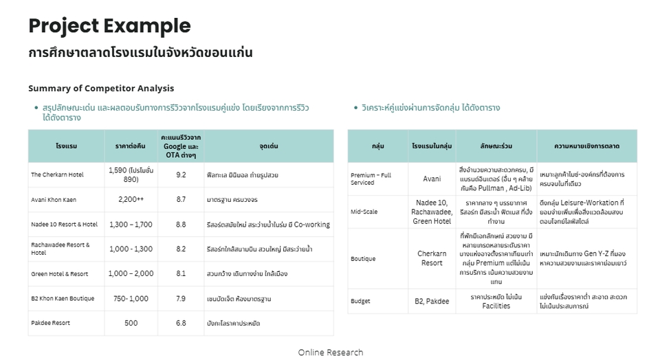 - Overview ศึกษาภาพรวมตลาดของธุรกิจ - Market Analysis วิเคราะห์ตลาด trend ที่จะเกิดขึ้นทิศทางของธุรกิจในอดีต เคยเป็นมาอย่างไร ปัจจุบันเป็นอย่างไร และจะเปลี่ยนแปลงอย่างไร *เรทนี้ไม่รวมcustomer servey