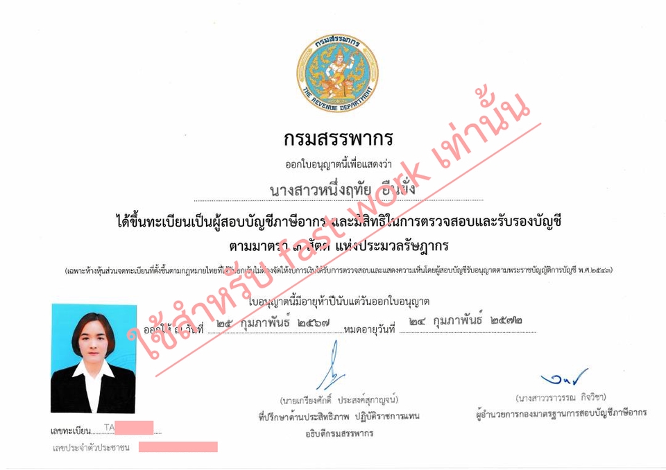 ประสบการณ์ทำงานสำนักงานบัญชีมามากว่า 9 ปี ดูแลและเข้าใจระบบอย่างแท้จริง ทำงานอย่างมืออาชีพ จบการศึกษาปริญญาตรี สาขาบัญชี ปัจจุบัน มีใบประกอบวิชาชีพทางบัญชี ดังนี้ CPA / TA / CPD