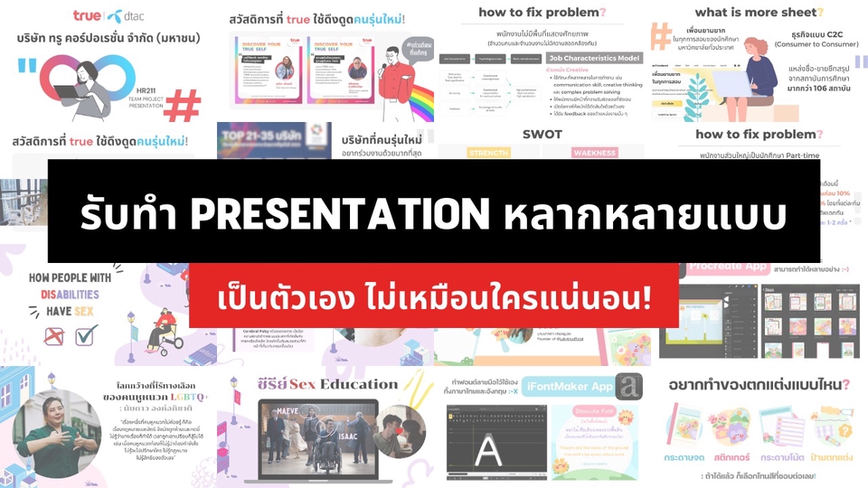 ด้วยประสบการณ์ออกแบบ Presentation เกี่ยวกับแผนธุรกิจ ข้อมูลองค์กร นำเสนองานวิจัย หรือเนื้อหาที่เกี่ยวข้องกับจิตวิทยา โดยสามารถย่อยข้อมูลจากยากเป็นข้อมูลที่ดูง่าย และน่าสนใจได้ เพราะสไลด์นำเสนองานที่ดี ต้องสามารถสื่อสารให้กับผู้ฟังได้ในระยะเวลาสั้นๆ และสร้างความประทับใจได้ตั้งแต่ครั้งแรกที่เห็น ดังนั้นในแต่ละงานของลูกค้า เราจะมีการปรับเนื้อหา และรูปแบบให้เหมาะสมกับจุดประสงค์ที่ลูกค้าต้องการ เพื่อให้ผู้ฟังเห็นภาพรวมและเข้าใจเนื้อหา ลูกค้าสามารถเลือกโทนสี / ฟอนต์ / mood ของงานที่ต้องการได้ โดยจำนวนสไลด์ขึ้นอยู่กับรายละเอียดงานของลูกค้า โดยใช้เวลาออกแบบไม่เกิน 2-3 วัน ตามลำดับคิวงานค่ะ ขั้นตอนการทำงาน 1. ลูกค้าแจ้งรายละเอียดและวัตถุประสงค์งานเบื้องต้น พร้อมส่งไฟล์ที่เป็นเนื้อหา / ข้อมูล เพื่อประเมินราคา 2. ส่งการประเมินราคาและระยะเวลาในการทำงาน เพื่อตกลงร่วมกันก่อนเริ่มงาน 3. เริ่มทำงาน และแก้ไขงานตามข้อตกลง 4. ส่งงาน Final ไฟล์ เป็น pdf. png. หรือ jpg. ตามที่ลูกค้าต้องการ 5. ลูกค้าสามารถแก้ไขงานได้ 2 รอบ โดยไม่มีค่าใช้จ่ายเพิ่มเติม