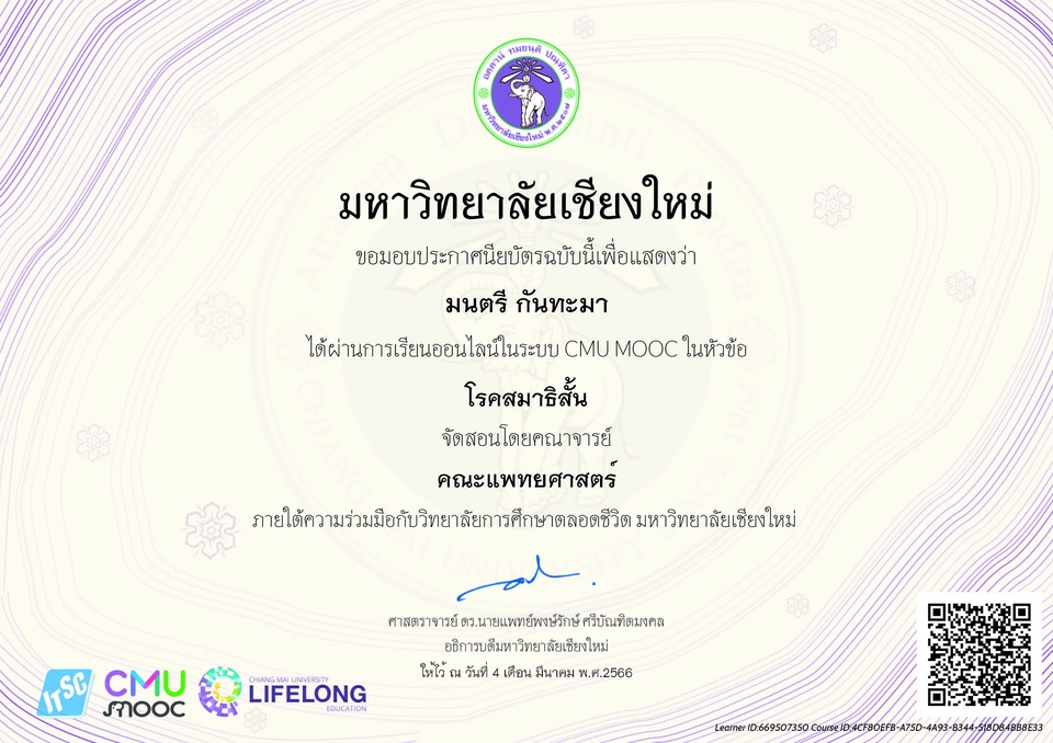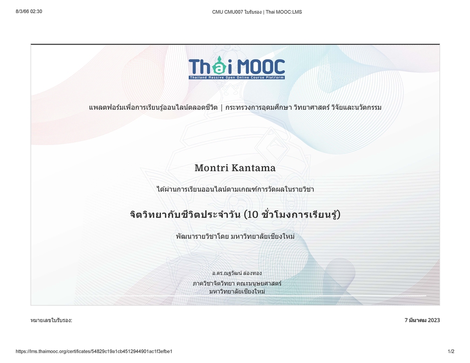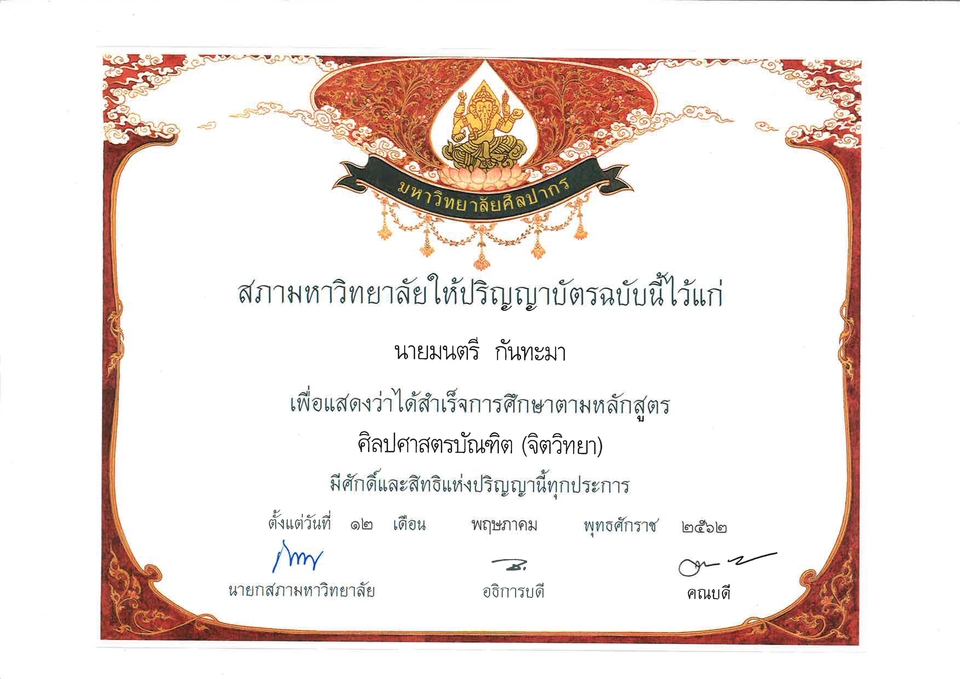 ประวัติการศึกษา ปริญญาตรี คณะศึกษาศาสตร์เอกจิตวิทยาและการแนะแนว มหาวิทยาลัยศิลปากร ปริญญาโท จิตวิทยาการให้คำปรึกษาภาค International มหาวิทยาลัยอัสสัมชัญ ประสบการณ์ให้คำปรึกษาอย่างเป็นทางการ 569 ชั่วโมง ให้คำปรึกษา Online ผ่านโปรแกรม Zoom, Facebook และ Line ในสภาวะวิกฤติโรคระบาด COVID-19