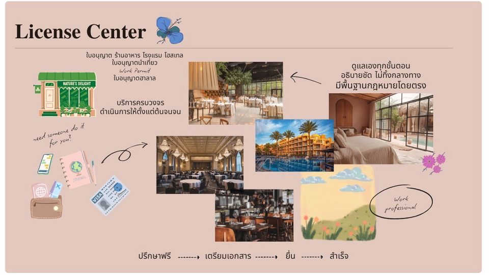 ให้บริการด้านเอกสารและใบอนุญาตครบวงจร สำหรับธุรกิจและบุคคลทั่วไป ครอบคลุม Work Permit, Visa, ใบอนุญาตโรงแรม/โฮสเทล/ร้านอาหาร, ใบอนุญาตฮาลาล, ใบอนุญาตบริษัทนำเที่ยว รวมถึงแปลเอกสารพร้อมรับรอง Notary ดูแลตั้งแต่ตรวจเอกสารเบื้องต้น ให้คำปรึกษาฟรี จัดเตรียมเอกสาร ยื่นเรื่อง ประสานงานหน่วยงานราชการ จนได้รับเอกสารครบจริง เหมาะสำหรับผู้ประกอบการ นักลงทุน และชาวต่างชาติที่ต้องการความถูกต้อง รวดเร็ว และบริการแบบครบจบในที่เดียว