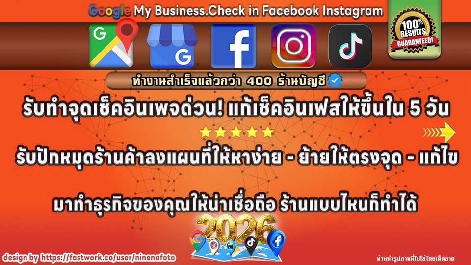 "ทำธุรกิจให้โดดเด่นครบทุกมิติและเพิ่มโอกาสเป็นที่รู้จักมากยิ่งขึ้น" คุณจะมองข้ามสิ่งเหล่านี้ไปไม่ได้ - ทำจุดเช็คอินใน TikTok สร้างหมุดให้ปรากฎบนแผนที่Tiktok ลูกค้าสามารถรีวิวได้อีกด้วย - ทำจุดเช็คอินแบบเชื่อมเพจ Facebook / สร้างเช็คอิน แก้เช็คอินเฟสไม่ขึ้น เอายอดวิวที่ลูกค้าเคยเช็คอินกลับมา - ทำจุดเช็คอิน Instagram /แก้เช็คอินไม่ขึ้น สามารถเช็คอินได้ทั้งไอจีสตอรี่และโพสต์ทั่วไป - ปักหมุดร้านลง Google Maps ให้ลูกค้าหาร้านเจอ เพิ่มสถานที่ให้ตรงแม่นยำ ให้ลูกค้ารีวิวให้คะแนนได้ ฯลฯ - เมื่อมีหมุดแล้วต้องยืนยันบัญชีเป็น Google My business เพื่อแสดงความเป็นเจ้าของหมุด คุณจัดการบัญชีได้เอง ตอบรีวิวได้ ตอบแชทได้ ยิงโฆษณาได้ ฯลฯ ***การันตีทำเช็คอินต้องซิงค์หรือเชื่อมกับเพจหลัก*** ***การันตีทำให้หมุดขึ้น มองเห็นได้แน่นอน หากทำไม่ได้ผมยินดีคืนเงินครับ*** -บริการลบหมุดในแผนที่ที่ไม่ใช้ออก -บริการย้ายหมุดและปักให้ตรงกับสถานที่จริง ร้านแบบไหนก็ทำได้ ต่างประเทศก็ทำได้ครับ ร้านเล็กร้านใหญ่ทำได้หมดครับ ทักมาสอบถามก่อนก็ได้นะครับ ขั้นตอนการทำงาน 1. คุยรายละเอียดงานให้ลูกค้าเข้าใจ กับสิ่งที่ลูกค้าจะได้รับ 2. ส่งใบเสนอราคาเพื่อให้ลูกค้าชำระเงินผ่านระบบของFastwork 3. ส่งแบบฟอร์มให้ลูกค้าเตรียมข้อมูลมาให้ฟรีแลนซ์ 4. เริ่มทำงาน 5. ส่งงานให้ลูกค้าพร้อมตรวจสอบความถูกต้อง/ แก้ไข/ อนุมัติงาน 6. หลังอนุมัติงานสำเร็จ พร้อมให้คำแนะนำ สอบถาม หากลูกค้าต้องการ