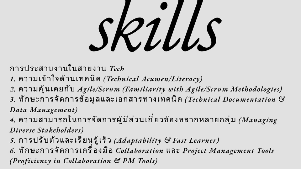 การประสานงานในสายงาน Tech 1. ความเข้าใจด้านเทคนิค (Technical ) 2. ความคุ้นเคยกับ Agile/Scrum 3. ทักษะการจัดการข้อมูลและเอกสารทางเทคนิค (Technical Documentation & Data Management) 4. ความสามารถในการจัดการผู้มีส่วนเกี่ยวข้องหลากหลายกลุ่ม (Managing Diverse Stakeholders) 5. การปรับตัวและเรียนรู้เร็ว (Adaptability & Fast Learner) 6. ทักษะการจัดการเครื่องมือ Collaboration และ Project Management Tools