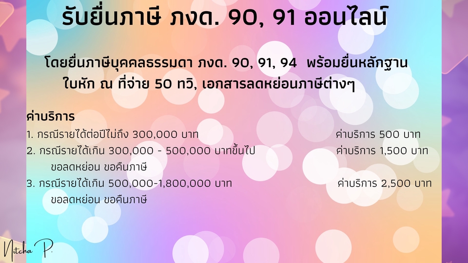 รับยื่นภาษี ภงด. 90, 91, 94 ออนไลน์ (ยื่นหลักฐาน ใบหัก ณ ที่จ่าย 50 ทวิ, เอกสารลดหย่อนภาษีต่างๆ)