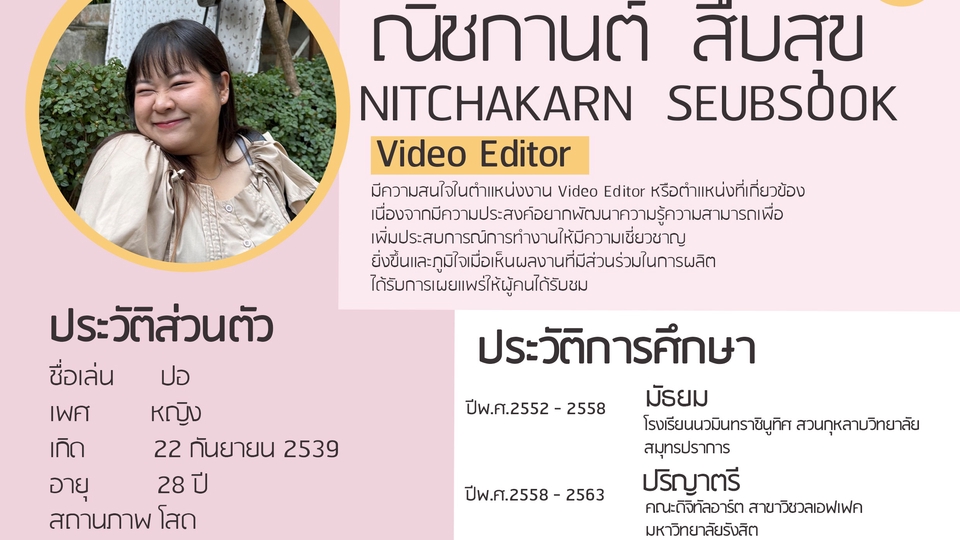 ประสบการณ์การทำงาน VFX และ Animation กว่า 4 ปี หน้าที่หลักคือ Compositor และรับฟรีแลนซ์ในด้านของ การทำ Graphic Motion VDO Editor และ KOLคิดคอนเทนต์ไปจนถึงตัดต่อสามารถจบงานได้ในคนเดียว