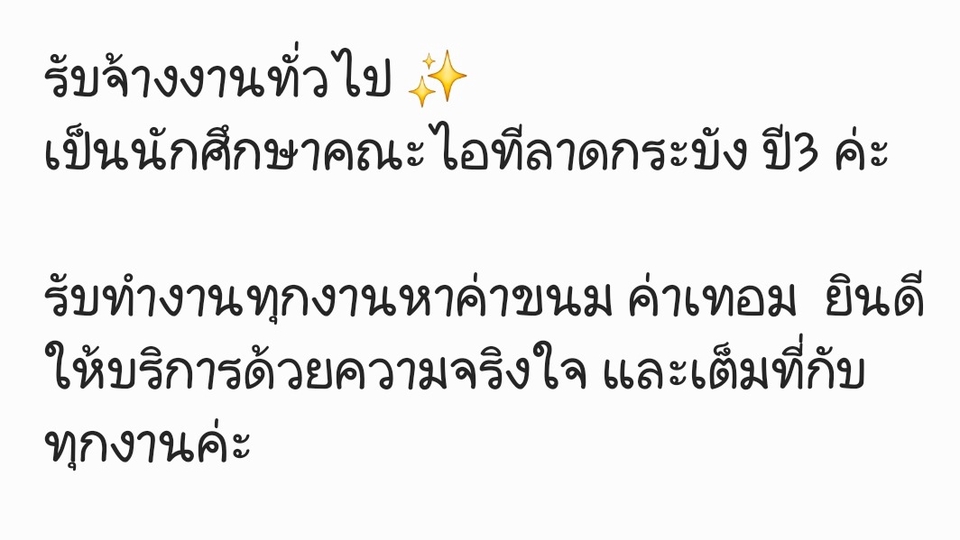 ชื่อน้ำขิงนะคะ เป็นนักศึกษาคณะไอทีค่ะ รับงานออกแบบ ux,ui,Frontend dev(HTML, CSS, bootstrap และ Javascript) และยังสามารถทำGUI ด้วยภาษา java ได้ นอกจากนี้ยังรับงานออกแบบ Presentation,Infographic,Poster,Resume,ใบปลิว พร้อมรับงานตลอดค่ะ เป็นกันเองคุยง่าย