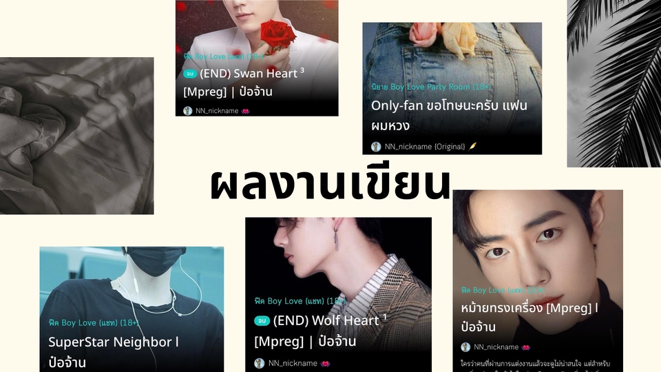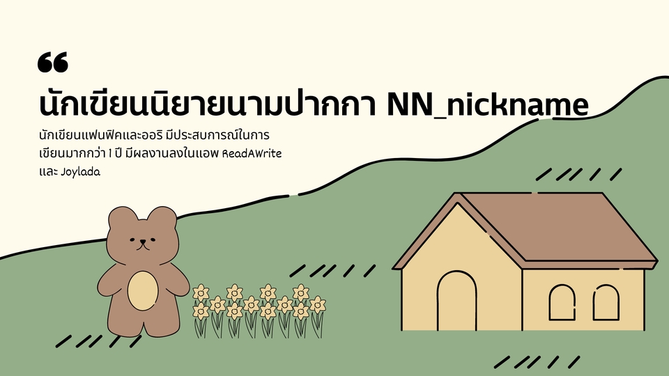 รับงานนักเขียนเงา เขียนนิยาย Yaoi/ชายหญิง ประเภทนิยายรัก, โรแมนติก, ดราม่า ทั้งในกรณีที่มีพล็อตและไม่มีพล็อต (คิดค่าพล็อตเพิ่ม) ระยะเวลาในการทำงาน 25-45 วัน (แล้วแต่จำนวนคำ) และสามารถส่งงานได้ไม่เกินวันละ 2 ตอนต่อวัน ตอนละ 1500-2000 คำ ส่งไฟล์ได้แบบทั้ง doc. และ pdf ** ไม่รับงานเขียนที่ผิดศีลธรรมทุกประเภท*** ขั้นตอนการทำงาน 1. เสนอพล็อตที่ต้องการ+พูดคุยองค์ประกอบต่างๆ ที่เกี่ยวข้อง ถ้าไม่มีพล็อตเพิ่มเวลาเขียนอีก 5 วัน 2. ประเมินจำนวนคำ+ตกลงราคาและกำหนด Deadline 3. เริ่มเขียนสตอรี่ ถ้าไม่มีพล็อตจะเริ่มเขียนพล็อตให้ก่อน 4. ส่งงานให้ทุกวัน วันละไม่เกิน 2 ตอน ตอนละ 1500-2000 คำ 5. รายงานความคืบหน้า 50% ตรวจสอบเนื้อหาและปรับแก้ 1-3 ครั้ง 6. เขียนสตอรี่อีก 50% ที่เหลือและส่งให้ตรวจสอบ 7. แก้คำผิด รีไรต์บางส่วนและส่งมอบงาน