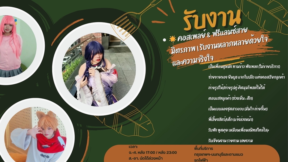 🙏คอสเพลย์หาตังค์ส่งตัวเองเรียน รับงานดูหนัง ฟังเพลง ทานข้าว ยืนบูธ แต่งคอส ถ่ายรูป ขายของ เป็นแบบสาวอวบ ตอบแชทลูกค้าช่วงเย็น พี่เลี้ยงเด็ก-สัตว์ได้ (แจ้งวันเวลา) กทม.-นนทบุรี ตามแนวรถไฟฟ้า วันไหนไม่ว่างจะแจ้งล่วงหน้า ทักได้เลย 💖