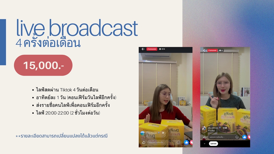 ฿14,000ไลฟ์สดผ่าน Tiktok 4 วันต่อเดือน อาทิตย์ละ 1 วัน (คอนเฟิร์มวันไลฟ์อีกครั้ง) ส่งรายชื่อคนไลฟ์เพื่อคอนเฟิร์มอีกครั้ง ไลฟ์ 20:00-22:00 (2 ชั่วโมงต่อวัน) **รายละเอียดสามารถเปลี่ยนแปลงได้แล้วแต่กรณี