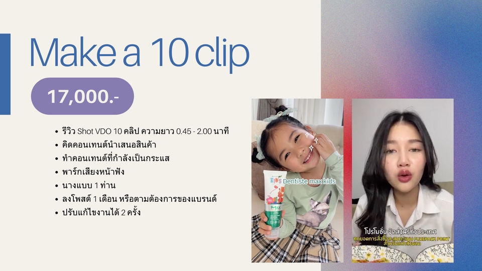 ฿17,000รีวิว Shot VDO 10 คลิป ความยาว 0.45 - 2.00 นาที คิดคอนเทนต์นำเสนอสินค้า ทำคอนเทนต์ที่กำลังเป็นกระแส พาร์กเสียงหน้าฟัง นางแบบ 1 ท่าน ลงโพสต์ 1 เดือน หรือตามต้องการของแบรนด์ ปรับแก้ไขงานได้ 2 ครั้ง