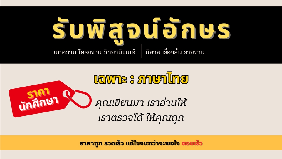 รับพิสูจน์อักษรภาษาไทยงานทุกประเภท ไม่ว่าจะเป็น - โครงงาน - บทความ - นิยาย - แฟนฟิค - วิทยานิพนธ์ - รายงาน แบ่งวรรค ตัดคำ จัดหน้ากระดาษ (สามารถพุดคุยตกลงรายละเอียดกันได้) ขั้นตอนการทำงาน 1. ลูกค้าแจ้งขอบเขตของงาน วันที่ต้องการ จำนวนหน้า 2. ส่งไฟล์ต้นฉบับ .docx 3. ทางร้านจะเสนอราคา ให้ลูกค้าตกลงราคา และวันที่ต้องการ 4. เริ่มทำงาน 5. ส่งงานให้ลูกค้าตามกำหนดวันจัดส่ง (แก้ไขได้หากไม่พอใจ)