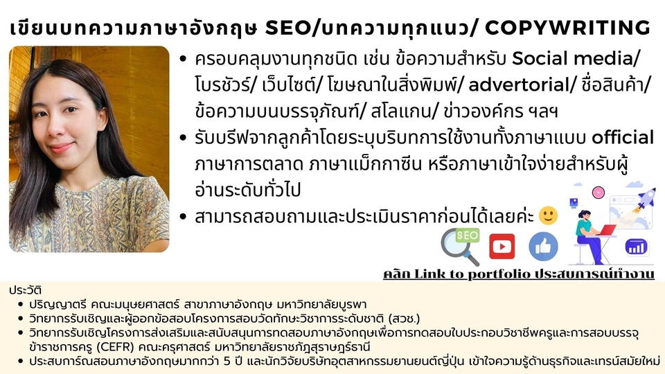 -นักศึกษา/นักกิจกรรม คณะมนุษยศาสตร์ เอกภาษาอังกฤษ - รับสอนภาษาอังกฤษทุกระดับชั้น - รับติวภาษาอังกฤษสอบเข้ามหาลัย GAT-PAT, O-NET, TOEIC -ปูพื้นฐานไวยกรณ์ภาษาอังกฤษ ติวสอบเพิ่มเกรด -รับงานแปลเอกสาร TH-ENG, ENG-TH -รับทำ Resume, Cover letter, CV -รับทำ สไลด์ presentation, ออกแบบโลโก้
