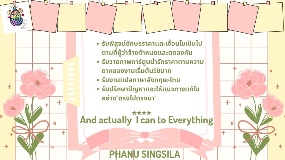รับพิสูจน์อักษร วาดภาพการ์ตูนน่ารักๆ เเปลภาษา ให้คําปรึกษาเชิงเเก้ปัญหาอย่างตรงไปตรงมา