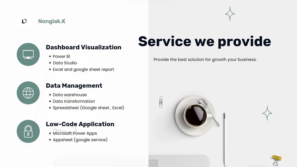 ยินดีให้คำปรึกษา ตั้งแต่การวางแผนการจัดเก็บข้อมูล การออกแบบ KPI , วิธีวัดผล การออกแบบรายงาน เพื่อให้ง่ายต่อการใช้งาน ภายใต้ concept เข้าใจได้ ใน 30 วินาที และสามารถให้คำแนะนำ ในแง่ของธุรกิจโลจิสติกส์ จากประสบการณ์ในสายงานโลจิสติกส์กว่า 6 ปี เพื่อช่วยสร้างความได้เปรียบทางด้านธุรกิจของลูกค้า