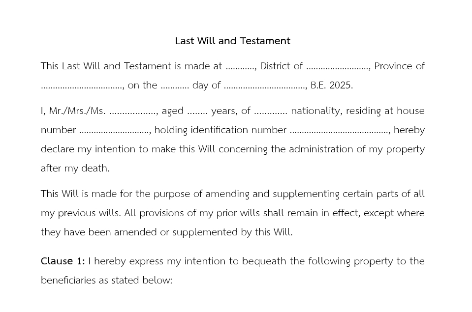 Professional will drafting service in Thai and English by an experienced lawyer. 1. We provide legally compliant wills in both Thai and English, tailored to suit the client’s assets and individual wishes. 2. The service includes succession law & basic legal consultation on matters such as witness signing procedures, will safekeeping, the duties of an estate administrator, and relevant inheritance laws. 3. Final documents will be delivered in PDF format. ขั้นตอนการทำงาน 1. ชี้แจงระบุรายละเอียดทรัพย์สินที่มีของเจ้าของผู้ทำพินัยกรรม (Clarify and list the details of the assets owned by the testator.) 2. ให้คำปรึกษาทางกฎหมายการจัดการมรดกเพื่อเป็นไปตามเจตนารมณ์ของผู้ว่าจ้าง (Provide legal consultation on estate planning to ensure it aligns with the client's intentions.) 3. ร่างพินัยกรรม และนำส่งให้ผู้ว่าจ้างตรวจสอบ (Draft the will and send it to the client for review.)
