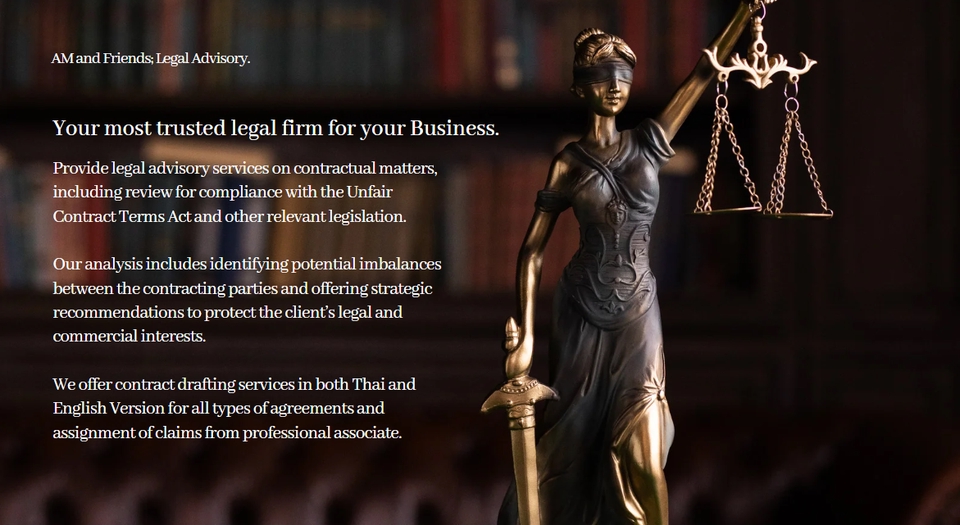 ฿1,000ให้คำปรึกษาด้านสัญญา ตรวจสอบความถูกต้องตามกฎหมายตามพ.ร.บ.ว่าด้วยสัญญาไม่เป็นธรรม และพิจารณาความได้เปรียบเสียเปรียบของคู่สัญญา และแนวทางการแก้ไขเสนอแนะ Provide legal advisory services on contractual matters, including review for compliance with the Unfair Contract Terms Act and other relevant legislation. Our analysis includes identifying potential imbalances between the contracting parties and offering strategic recommendations to protect the client’s legal and commercial interests.