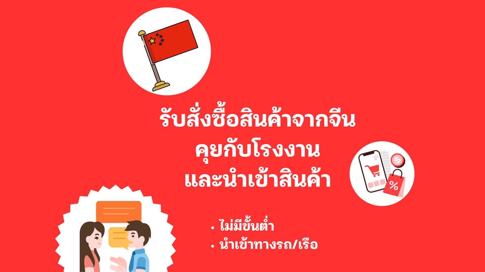 บริการรับสั่งซื้อ คุยกับร้านค้า/โรงงาน และนำเข้าสินค้าจากจีน - สามารถสั่งจากเว็บ Taobao, Tmall, 1688, Alibaba และ Xianyu ได้ค่ะ - หากลูกค้ายังไม่มีโรงงานที่ต้องการสั่ง แต่มีรูปภาพสินค้า สามารถส่งมาเพื่อให้ค้นหาให้ได้ค่ะ - รับสั่งสินค้าเล็ก ใหญ่ ไม่มีขั้นต่ำ - การนำเข้า มีให้เลือกว่าต้องการนำเข้าทางรถ หรือทางเรือ *ทางฟรีแลนซ์เป็นเพียงผู้ประสานงานเท่านั้น หากสินค้าเสียหายต้องเจรจากับทางโรงงานที่ผลิต หรือร้านค้าค่ะ ขั้นตอนการทำงาน 1. ผู้จ้างแจ้งรายละเอียดสินค้า ที่อยู่ที่ต้องการให้จัดส่ง(ในไทย) ขอบเขตความต้องการ 2. ฟรีแลนซ์ติดต่อร้านค้า/โรงงาน จากนั้นจึงชำระค่าสินค้า 3. รอสินค้ามาส่ง ฟรีแลนซ์แจ้งค่าส่ง+ค่าบริการ