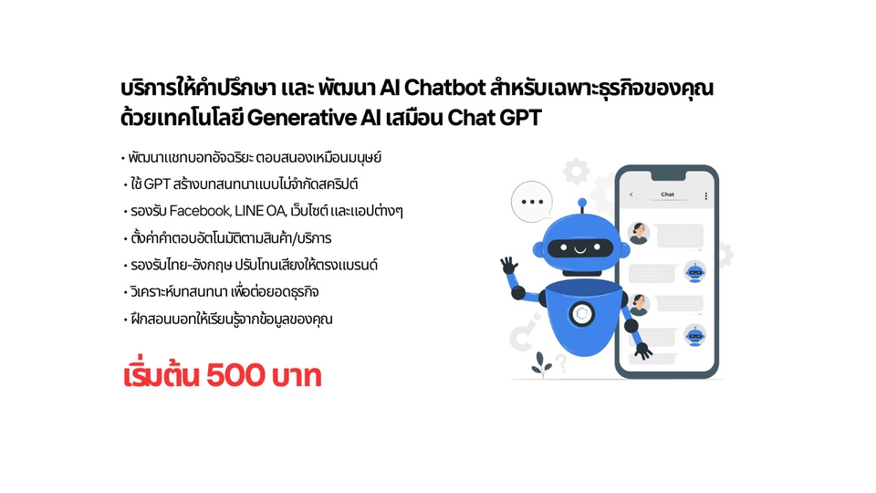 • พัฒนา Chatbot อัจฉริยะที่เข้าใจภาษาธรรมชาติ ตอบโต้ได้เหมือนมนุษย์ • ใช้เทคโนโลยี GPT / Generative AI เพื่อสร้างบทสนทนาแบบไดนามิก ไม่จำกัดเฉพาะสคริปต์ • เชื่อมต่อกับช่องทางต่างๆ เช่น Facebook, LINE OA, เว็บไซต์ หรือแอปพลิเคชันของคุณ • ตั้งค่าคำตอบเฉพาะทาง เช่น แนะนำสินค้า, ตอบคำถามลูกค้า, รับออเดอร์ • รองรับทั้งภาษาไทยและอังกฤษ พร้อมปรับแต่งให้เหมาะกับโทนเสียงของแบรนด์ • วิเคราะห์ข้อมูลการสนทนา เพื่อนำไปใช้พัฒนาธุรกิจต่อยอด • มีระบบฝึกสอน Chatbot ให้เก่งขึ้นตามข้อมูลของธุรกิจคุณ