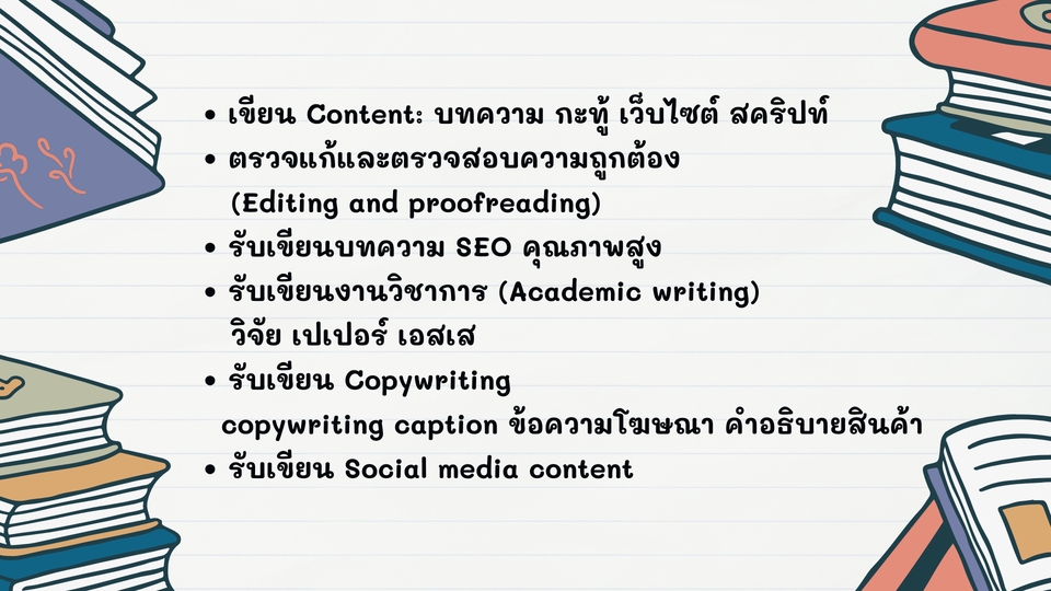 จบจาก มอ. นานาชาติด้วยเกียรตินิยมอันดับ 1 ประเภทงานที่รับเขียน - บทความ SEO - บทความวิชาการ - บทความวิจัย รายงาน เอสเส - บทความภาษาอังกฤษ - บทความออนไลน์ลงเว็บไซต์ - Copy writing ข้อความโฆษณา สโลแกน แคปชั่นลงโซเชียล - และอื่นๆ ขั้นตอนการทำงาน 1. ตกลงหัวข้อและรายละเอียดงาน 2. ส่งไฟล์งานให้ และสามารถปรับแก้ได้ 1 ครั้ง