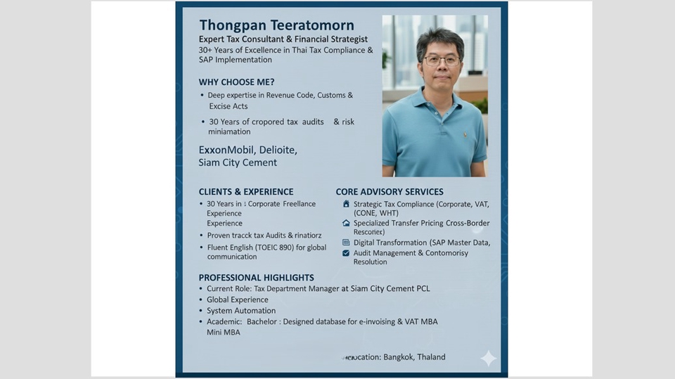 Senior Tax Specialist | 30+ Yrs Exp Expert in Revenue Code, Customs & Excise. Lately Tax Manager at Siam City Cement. Specializing in compliance, BOI, Transfer Pricing, and tax audits. Strong SAP/IT skills for automated tax reporting. Chulalongkorn Accounting & Mini MBA. TOEIC 890.