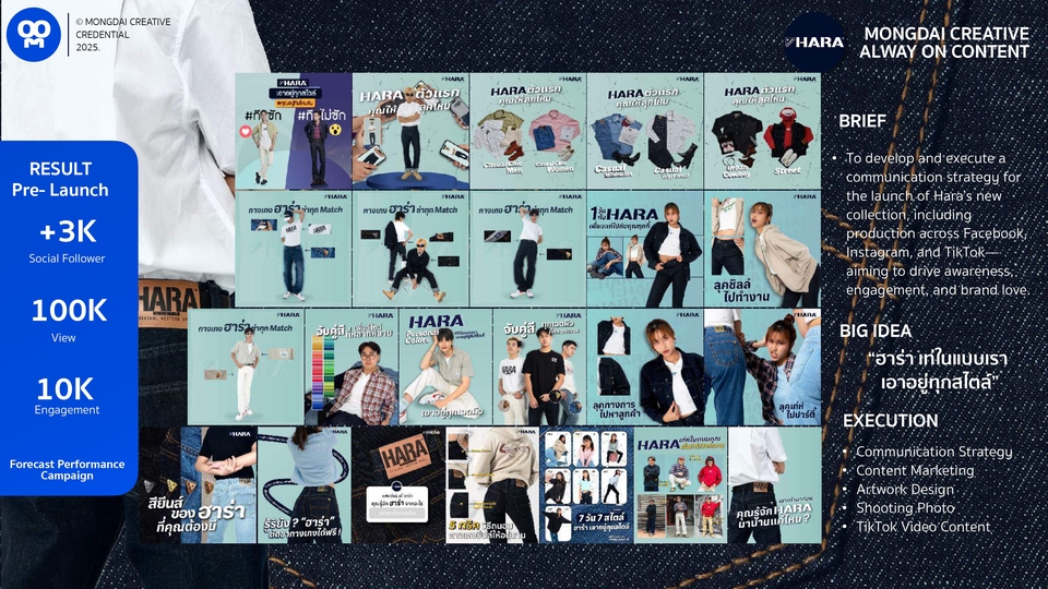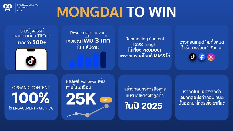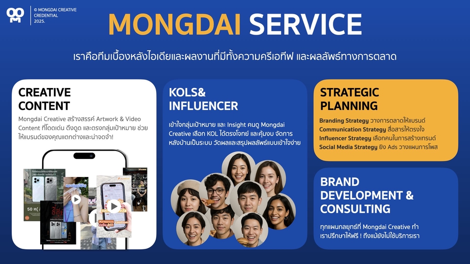 คอนเทนต์ดีไซน์ (Artwork + Caption) Content Strategy (วิเคราะห์ Insight + เทรนด์ + Customer Journey) คิด Big Idea / Monthly Campaign + Calendar 👉 เหมาะกับธุรกิจที่ต้องการ Always-On Marketing อย่างจริงจัง สร้างยอดขาย + Brand Loyalty