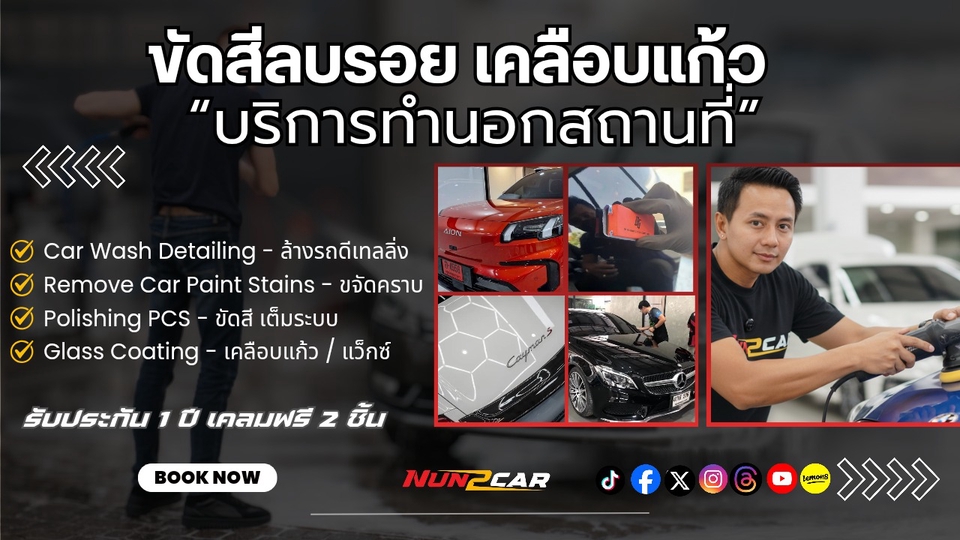 ปัญหาสีรถที่คุณจะต้องเจอ👉 รอยขีดข่วน, แสงแดดUV, สีซีด, คราบน้ำ, ขี้นก, ปัญหาอีก 108 ที่จะมาทำให้สีรถคุณพัง **รับเคลือบแก้ว นอกสถานที่ [ถึงบ้านคุณ]** ผมเปลี่ยนรถคุณให้เงาฉ่ำ คงความใหม่ได้นานสูงสุด 4 ปี คุณไม่ต้องเสียเวลาไปศูนย์ ไม่ต้องรอคิว และไม่ต้องทิ้งรถไว้ที่ร้าน ให้เกิดความกังวล ผมยกบริการพรีเมี่ยมไปทำให้ถึงหน้าบ้านคุณ แบบ VIP 💢ผลงานการเคลือบรถมาแล้วกว่า 1,000 คัน💢 ประสบการณ์ทำทั้งรถบ้าน โชรูมรถป้ายแดง และเต็นท์รถมือสอง ===== สิ่งที่ลูกค้าต้องเตรียม : 1. ทำถึงบ้าน ลูกค้าเตรียมสถานที่ในร่ม และสว่าง 2. ใกล้จุดก๊อกน้ำ หรือมีสายยาง สามารถลากมาถึงได้ 3. ใกล้จุดเสียบปลั๊กไฟ ห่างไม่เกิน 10 เมตร จากจุดที่ทำงาน ===== ขั้นตอนการทำงาน : 1. ล้างรถ - เก็บความสะอาด ขจัดคราบยางมะตอย - เตรียมผิวให้เรียบ สะอาดก่อนการขัดเคลือบ 2. ติดกระดาษกาวบริเวณมุมเสี่ยงต่อการทำลายสีรถ 3. ขัดสีตัวรถเต็มระบบ - ลบรอยขนแมว เกิดจากการเช็ดรถ ปัดฝุ่น - ลบรอยใยแมงมุม ที่อาจเกิดจากการขัดสีรถที่ไม่ถูกต้อง - ขัดสีรถ ด้วยเครื่องขัด DA คุณภาพสูง - ใช้ผ้าไฟเบอร์เฉพาะ เพื่อป้องกันการเกิดรอยซ้ำ 4. เช็ดพื้นผิวด้วยน้ำยา ทำความสะอาด เพื่อเตรียมผิวในการเคลือบแก้ว 5. เคลือบแว็กซ์ หรือ เคลือบแก้ว (ตามแพคเกจที่ลูกค้าต้องการ) #เคลือบแว็ก - One Step Polish Menzerna (เงาเข้ม ผิวลื่น ติดทนนาน 1-2 เดือน) (สำหรับโชว์รถ) #เคลือบแก้ว - DG Graphene 10H (เงาฉ่ำ ผิวไม่ลื่นมาก ปกป้องรถจากมลภาวะต่าง ไล่น้ำได้ดี ติดทนนาน 4 ปี 6. ลงน้ำยาเคลือบกระจกรอบคัน ป้องกันน้ำเกาะ 7. ลงน้ำยาเคลือบชิ้นส่วน พลาสติกสีดำ ที่มีความซีด จากแสงแดด UV 8. เคลือบยางดำ 9. ลูกค้าตรวจรับรถ ส่งงาน ===== ✅ บริการถึงที่ ไม่ว่าจะอยู่ที่บ้าน ที่คอนโด ที่ทำงาน เราพร้อมเสิร์ฟความเงารถถึงคุณ ***รับงานบริการได้ทุกวัน*** ✅ ทำได้วันละ 1 คันเท่านั้น ✅ ใช้เวลาในการทำ 3-5 ชม. [แล้วแต่สภาพผิวรถยนต์] (บริการทั่วกรุงเทพฯ ปริมณฑล)