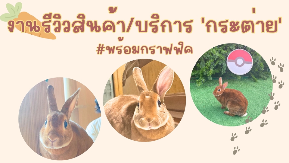 รีวิวสินค้าของ "กระต่าย' ใน... - IG - Facebook - Tiktok พร้อมทำกราฟฟิคโปรโมทให้ พร้อมโพสต์ลงโซเซี่ยลมีเดีย น้องกระต่าย อายุ 4 ปี เพศเมีย พันธุ์ Minirex ขั้นตอนการทำงาน 1. สามารถแจ้งรายละเอียดงาน 2. ประเมินระยะเวลาการทำงาน 3. ดำเนินการทำงาน 4. แก้ไขได้ 2 ครั้ง 5. ส่งงาน