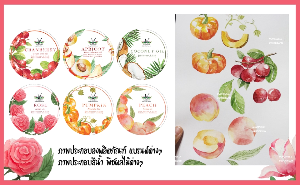 งานภาพประกอบสีน้ำ สีไม้ และกราฟฟิค ทางเราสามารถทำได้ทุกๆแบบ เพื่อนำไปใช้งานต่อกับสินค้าของคุณ ของขวัญให้ไอดอล คนที่คุณรัก และส่งมอบความรู้สึกดีๆ ผ่านภาพวาดขอองเรา ขั้นตอนการทำงาน 1. ส่งภาพที่ต้องการให้วาด และวัตถุประสงค์ของการนำไปใช้ (เพื่อเลือกกระดาษที่เหมาะสม และใช้กระดาษที่เหมาะสมสำหรับงานการ์ด และใส่กรอบ) 2. ในกรณีภาพประกอบจะเริ่มงานได้เลย แต่ถ้าในกรณีแบรนด์ อาจต้องคุยเรื่องภาพลักษณ์แบรนด์ เพื่อปรึกษาเรื่องความเหมาะสมของภาพประกอบกับแบรนด์ 3. ร่างภาพ (ส่งงานให้ดู และแก้ไข เพื่อลงสี) 4. ลงสีภาพ (ช่วงนี้จะส่งภาพ Update ให้ดู วันต่อวัน ในวันที่ลงมือทำงานจริงทุกๆวัน) 5. ปรับแต่งแก้ไขงานเล็กน้อย และส่งมอบภาพ