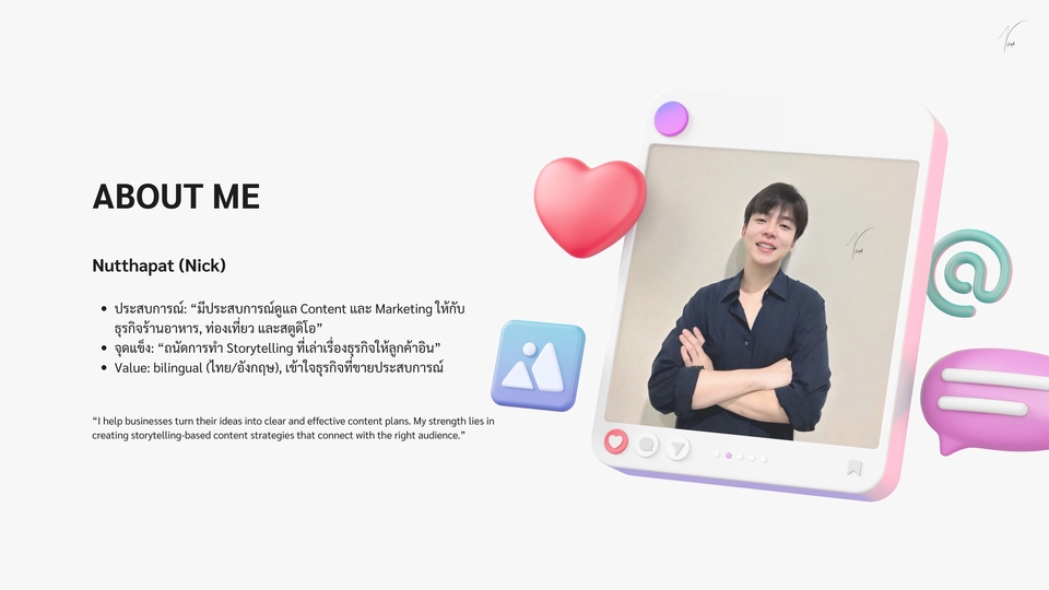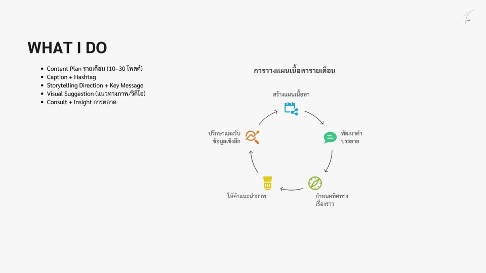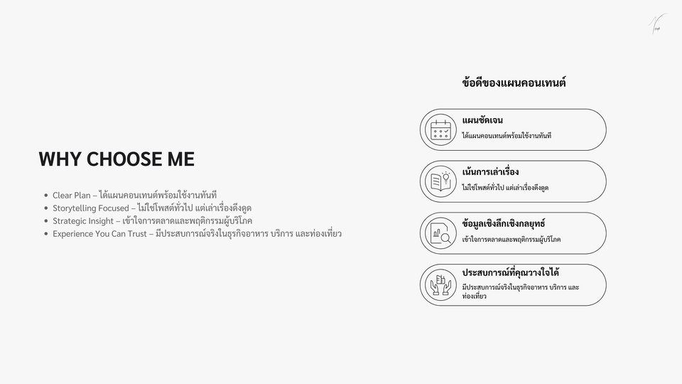 Content Plan for Social Media ผมช่วยวางแผนคอนเทนต์รายเดือนสำหรับธุรกิจของคุณ โดยออกแบบเนื้อหาให้สอดคล้องกับกลยุทธ์การตลาดและเป้าหมายที่ต้องการ ไม่ว่าจะเป็นการสร้างการรับรู้แบรนด์ (Brand Awareness) การดึงดูดลูกค้าใหม่ หรือการสื่อสารเพื่อรักษาฐานลูกค้าเดิม จุดเด่นของผมคือการทำคอนเทนต์ที่เล่าเรื่องได้ (Storytelling) เหมาะกับธุรกิจที่ต้องการขาย “ประสบการณ์” เช่น ร้านอาหาร คาเฟ่ ธุรกิจบริการ ทัวร์ หรือสตูดิโอ ผมจะช่วยให้คุณมีคอนเทนต์ที่ต่อเนื่อง ชัดเจน และตอบโจทย์ลูกค้าในแต่ละแพลตฟอร์ม ขั้นตอนการทำงาน 1. พูดคุยเพื่อเข้าใจธุรกิจและเป้าหมาย 2. วิเคราะห์กลุ่มเป้าหมายและโทนการสื่อสาร 3. วาง Content Plan รายเดือน (หัวข้อ + Key Message) 4. เขียน Caption + Hashtag แนะนำ 5. แนะนำรูปแบบภาพ/วิดีโอประกอบ 6. ปรับแก้ไขตาม Feedback (สูงสุด 2 ครั้ง) 7. ส่งมอบ Content Calendar พร้อมใช้งาน