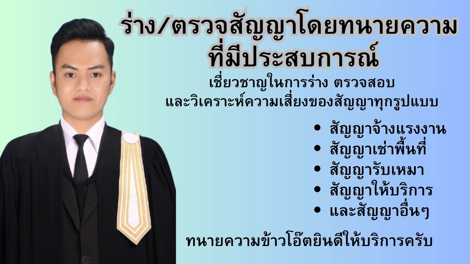 สวัสดีครับ ลูกค้าทุกท่าน ผมเป็นทนายความ ชื่อว่า ข้าวโอ๊ต ที่มีประสบการณ์ด้านกฎหมายธุรกิจและงานสัญญา ให้บริการรับร่าง ตรวจสอบ และปรับปรุงสัญญาให้เหมาะสมกับสถานการณ์จริงของแต่ละธุรกิจ โดยเน้นความถูกต้องตามกฎหมาย ชัดเจน ปลอดภัย และสามารถใช้ได้จริงในทางปฏิบัติ