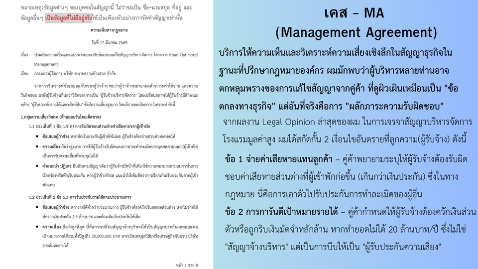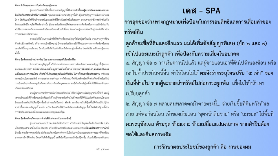 ฿800- ให้ข้อเสนอแนะทางกฎหมายที่จำเป็นของคู่สัญญาฝ่ายลูกค้า ข้อความที่ควรเพิ่ม/ลบออก (ตัวอักษรสีแดง) และสามารถแก้ไขได้จนมีการเซ็นสัญญา - รีวิวสัญญา ไม่เกิน 7 หน้า (800 บาท) หากเกิน 7 หน้า (1,000 บาท)