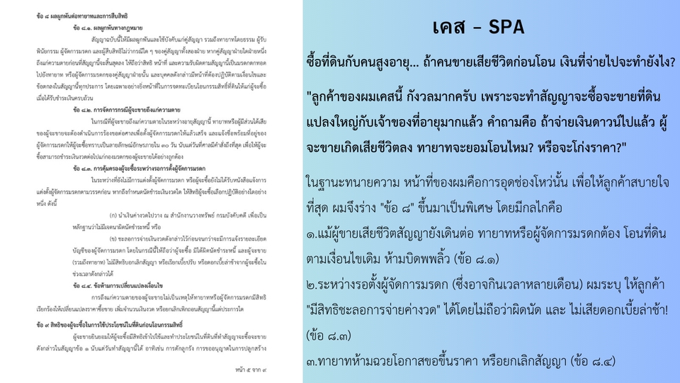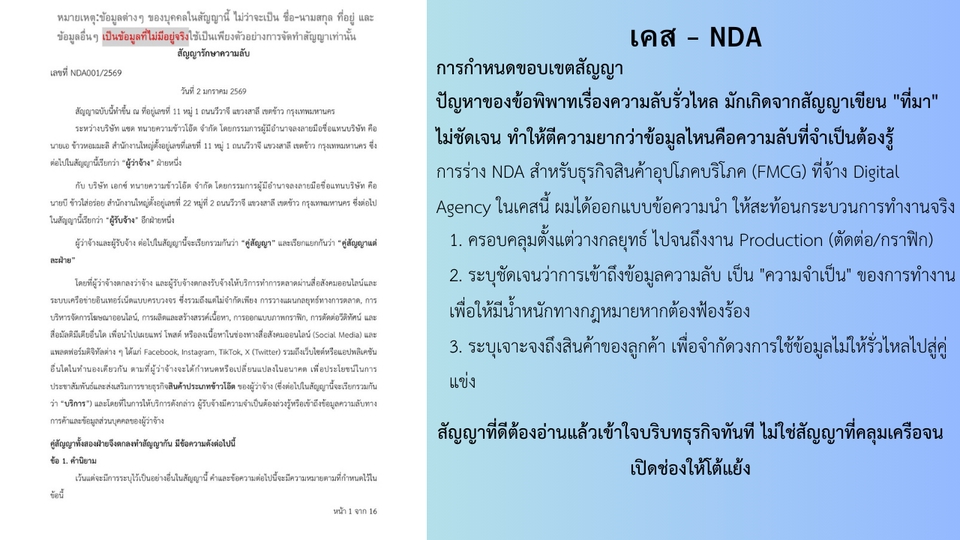 บริการร่าง ตรวจสอบ แก้ไขสัญญาทุกประเภท โดยทนายความธุรกิจที่มีใบอนุญาต สัญญาชัดเจน รัดกุม ลดความเสี่ยงในอนาคต ค่าบริการสมเหตุสมผล ปรึกษาเบื้องต้นฟรี! บริการของเรา ร่างสัญญา (Drafting) สร้างสรรค์สัญญาที่รัดกุม ชัดเจน ครอบคลุมทุกประเด็นสำคัญ เพื่อปกป้องผลประโยชน์ของลูกค้า ตรวจสอบและให้ความเห็น (Reviewing) วิเคราะห์สัญญาทุกแง่มุม ชี้ให้เห็นถึงข้อได้เปรียบ เสียเปรียบ และจุดเสี่ยง แก้ไขและเจรจาต่อรอง (Editing & Negotiation) ปรับปรุงเงื่อนไขในสัญญาให้เป็นธรรมและเหมาะสมกับสถานการณ์ของลูกค้า ทำไมต้องเลือกเรา? ทนายความวิชาชีพ มั่นใจได้ว่าสัญญาทุกฉบับถูกต้องตามกฎหมายและมีผลบังคับใช้ เชี่ยวชาญกฎหมายธุรกิจ เราเข้าใจความต้องการของธุรกิจลูกค้าและสามารถให้คำแนะนำที่นำไปใช้ได้จริง บริการที่รวดเร็วและเป็นระบบ เราใส่ใจในทุกขั้นตอน เพื่อให้ลูกค้าได้รับสัญญาที่สมบูรณ์แบบทันต่อความต้องการ ดูแลสัญญาทุกประเภท อาทิ สัญญาจ้างงาน, สัญญาซื้อขาย, สัญญาเช่า, สัญญาร่วมทุน, สัญญาบริการ, สัญญากู้ยืม, และสัญญาเฉพาะทางอื่นๆ คุ้มกว่าแน่นอน! เมื่อเทียบกับความเสียหายที่อาจเกิดขึ้นในอนาคต ปรึกษาเราก่อนตัดสินใจ ปกป้องสิทธิของลูกค้า ขั้นตอนการทำงาน 1. ร่าง/ตรวจสัญญา และเป็นสัญญาเกี่ยวกับอะไรครับ 2. ลูกค้ามีสิทธิ จะให้ทางทนายความร่างสัญญาเป็นแบบฟอร์มโดยไม่ส่งข้อมูลส่วนตัว หรือส่งข้อมูลส่วนตัวเพื่อร่างสัญญาให้พร้อมใช้งาน 3. ต้องการให้เพิ่มส่วนไหนเป็นพิเศษหรือเน้นส่วนไหนเป็นพิเศษแจ้งได้ครับ 4. ทนายความจัดทำสัญญา 5. ส่งงานให้ลูกค้าครับ