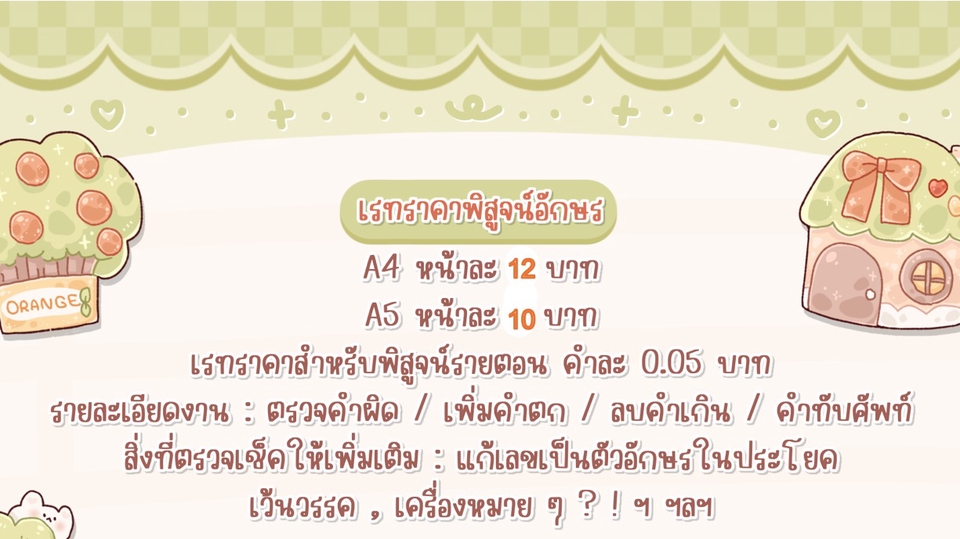 รับงานพิสูจน์อักษรทุกประเภท เช่น นิยาย วรรณกรรม รายงาน โปรเจกต์ วิจัย งานเร็ว สามารถเร่งงานได้เร็วสุด 24 ชั่วโมง (ในกรณีที่ชิ้นงานมีความยาวไม่เกิน 100,000 คำ) ตรวจขั้นต่ำสามรอบทุกชิ้นงาน ขั้นตอนการทำงาน 1. ลูกค้าส่งบรีฟพร้อมแจ้งวันเวลาที่ต้องการรับชิ้นงาน และส่งชิ้นงานเพื่อประเมินราคา 2. ลูกค้ารับทราบราคา อนุมัติให้เริ่มงาน 3. เมื่อดำเนินการเสร็จสิ้นจะแจ้งให้รับทราบ นำส่งไฟล์ตัวอย่างหรือไฟล์ PDF พร้อมลายน้ำเพื่อยืนยันว่าชิ้นงานเสร็จสิ้น 4. เมื่อดำเนินการชำระเงินเรียบร้อยแล้วทางร้านจะนำส่งไฟล์สมบูรณ์หรือไฟล์ word ต่อไป หากพบว่าตัวงานไม่สมบูรณ์หรือมีจุดที่ต้องการแก้ไขสามารถติดต่อทางร้านได้ภายในสามวันหลังรับไฟล์งาน