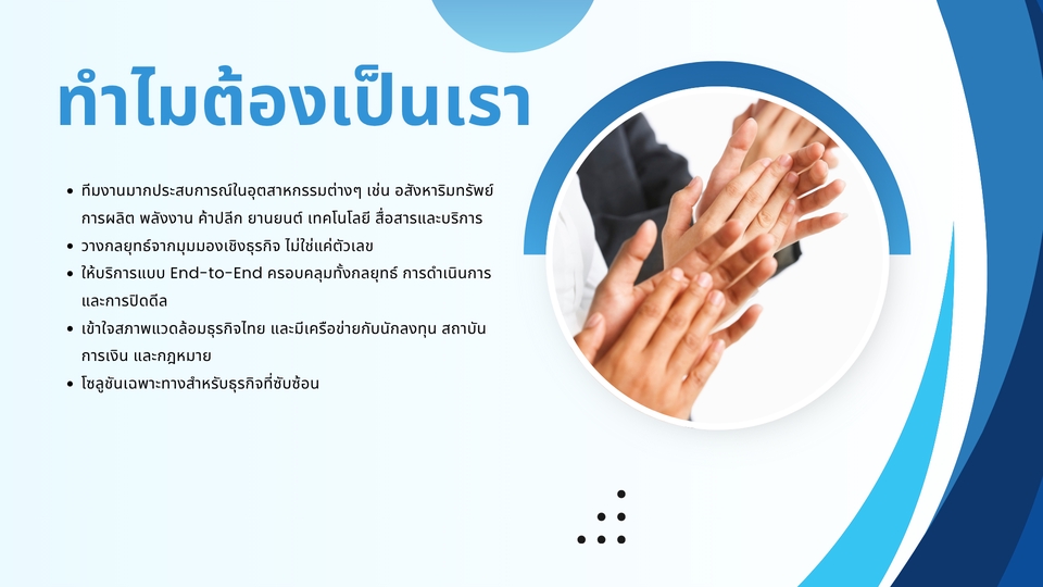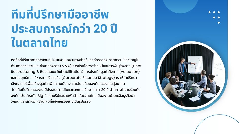เราคือทีมงานผู้เชี่ยวชาญด้าน M&A, ปรับโครงสร้างหนี้, ฟื้นฟูกิจการ, ประเมินมูลค่ากิจการ และกลยุทธ์การเงินองค์กร เราให้คำปรึกษาเชิงลึกพร้อมลงมือทำจริง เพื่อช่วยให้คุณผ่านจุดเปลี่ยนสำคัญทางธุรกิจอย่างมั่นคง เหมาะสำหรับ: ธุรกิจที่ต้องการขาย/ซื้อกิจการ องค์กรที่มีปัญหาสภาพคล่องหรือต้องการฟื้นฟูกิจการ นักลงทุนหรือผู้บริหารที่ต้องการคำแนะนำจากมืออาชีพที่มีประสบการณ์จริงในดีลมูลค่าสูง บริการหลัก: ✅ ควบรวมและซื้อกิจการ (M&A) ✅ ปรับโครงสร้างหนี้ / ฟื้นฟูกิจการ ✅ ประเมินมูลค่ากิจการ ✅ กลยุทธ์การเงินและบัญชีระดับสูง ขั้นตอนการทำงาน 1. พูดคุยทำความเข้าใจปัญหา (Discovery Call) นัดคุยทางโทรศัพท์หรือทางchatเพื่อให้ลูกค้าเล่าปัญหา เป้าหมาย หรือสิ่งที่ต้องการให้เราช่วย 2. ประเมินขอบเขตงาน + เสนอแนวทาง (Proposal) หลังจากเข้าใจบริบท ทางเราจะสรุปขอบเขตงาน สิ่งที่ลูกค้าจะได้รับ และระยะเวลาการทำงาน 3. เริ่มต้นวางแผนและทำงาน (Work Process) ทำงานร่วมกันตามขั้นตอน เช่น วิเคราะห์ปัญหา, จัดทำเอกสาร, วางกลยุทธ์ หรือเตรียมเอกสารเพื่อการเจรจา ฯลฯ 4. ส่งมอบผลงานและสรุปผล (Delivery & Wrap-up) ส่งมอบงานในรูปแบบเอกสาร/Presentation พร้อมสรุปสิ่งที่ทำ แนะนำขั้นตอนถัดไป และตอบคำถามหลังจบงาน 5. (Optional) นัดติดตามผล (Follow-up) หากเป็นแพ็กเกจรายเดือนหรือมีการติดตาม เราจะมี Session เพื่อตรวจสอบผลลัพธ์ และปรับแผนตามสถานการณ์จริง