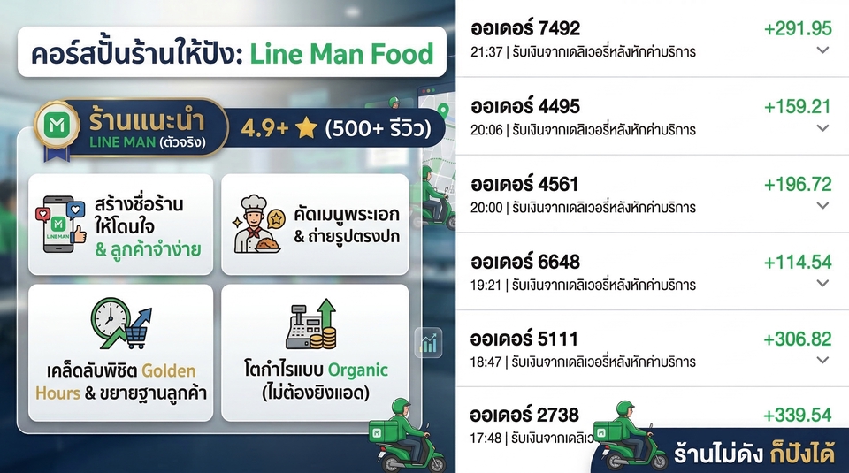เบื่อไหม? ทำอาหารอร่อยแต่ไม่มีออเดอร์... จ่ายค่าโฆษณาทุกวัน แต่กำไรไม่เหลือ! ในสมรภูมิ LINE MAN ยุค 2026 นี้ ปลาใหญ่ไม่ได้กินปลาเล็กครับ แต่ "ปลาที่รู้ระบบ จะกินรวบทุกพื้นที่!" สวัสดีครับ ตลอดระยะเวลา 3 ปีที่ผ่านมา ผมได้เปิดคอร์สสอนและให้คำปรึกษาแก่เจ้าของร้านอาหารเดลิเวอรี่มาอย่างต่อเนื่อง ได้มีโอกาสพูดคุย วิเคราะห์ และช่วยแก้ปัญหาให้คนขายอาหารบนแอปพลิเคชัน LINE MAN ตัวจริงเสียงจริงมาแล้วกว่า 2,000 เคส จากประสบการณ์ทั้งหมด ผมค้นพบความจริงที่โหดร้ายข้อหนึ่งคือ... "ความล้มเหลวของร้านส่วนใหญ่ มีแพทเทิร์นเดียวกัน" หลายคนทำอาหารอร่อยมาก แต่มองข้าม "ระบบ" มัวแต่รอเก็บทุนแต่งร้านสวยๆ หรือยอมเทหมดหน้าตักเพื่อยิงโฆษณา (Ads) หวังให้คนเห็น แต่พอกดปิดแอด ออเดอร์ก็หายวับไปกับตา นี่คือการทำธุรกิจแบบยืมจมูกคนอื่นหายใจครับ การเรียนคอร์สออนไลน์หรืออ่านบทความทั่วไป อาจจะให้แค่ทฤษฎี แต่ไม่ได้เจาะลึกถึง "บาดแผล" ของร้านคุณ ผมจึงเปิดบริการ VIP Coaching (ปรึกษาตัวต่อตัว) บน Fastwork เพื่อจับมือคุณทำ และแก้ปัญหาแบบเฉพาะเจาะจงรายบุคคล (Customized Solution) แบบไม่มีกั๊ก! 🔥 ทำไมต้องเลือกเรียนและปรึกษากับผม? (จุดเด่นของงาน) เน้น เข้าใจระบบ LINE MAN ไม่ต้อง "เผาเงินยิงแอด" ผมจะสอนวิชาที่คุณหาเรียนจากโรงเรียนทำอาหารที่ไหนไม่ได้ นั่นคือเทคนิคทำให้ลูกค้าค้นหาคุณเจอเองเป็นอันดับแรกๆ โดยไม่ต้องเสียค่าโฆษณาสักบาท ปลดล็อค "3 ความอร่อย" ที่คน 90% ไม่รู้ ร้านเจ๊งไม่ใช่เพราะไม่อร่อย แต่เพราะไม่เข้าใจว่า ความอร่อยมี 3 แบบ: อร่อยจากคนทำ (รสชาติที่เราชอบ) อร่อยจากคนกิน (ความคุ้มค่าและตรงปก) อร่อยจากระบบ LINE MAN (AI ชอบรูปภาพ, Keyword และคะแนนรีวิวของคุณ) ผมจะสอนให้คุณปรุง "ความอร่อยแบบที่ 3" เพื่อให้ระบบรักร้านคุณ และส่งลูกค้ามาให้ไม่ขาดสาย ใช้ "ครัวที่บ้าน" ก็จับเงินล้าน แซงงานประจำได้ คุณไม่จำเป็นต้องมีเงินทุนหลักแสนเพื่อเช่าตึกแถว หรือจ้างเชฟมิชลิน สิ่งที่คุณต้องมีคือ "หม้อ กระทะ ตู้เย็น" ที่บ้าน และ "เทคนิคที่ผมจะมอบให้" ผมจะสอนวิธีปั้นร้านลับ (Cloud Kitchen) จากศูนย์ ให้มีออเดอร์เด้งรัวๆ สอนจากประสบการณ์จริง 2,000+ เคส (Real Data) ทุกเทคนิคที่ผมแนะนำ ไม่ใช่ทฤษฎีมโนแต่อย่างใด แต่มาจากการลงมือทำจริง แก้ปัญหาจริง เห็นผลลัพธ์มาแล้วนับครั้งไม่ถ้วน เจ็บจริง จ่ายจริง และรู้ว่าทางไหนคือ "ทางลัด" ที่ปลอดภัยที่สุดสำหรับคุณ 🎯 บริการนี้เหมาะกับใคร? มือใหม่ 100%: มีแค่ครัวที่บ้าน อยากหารายได้เสริมหรือรายได้หลัก แต่ไม่รู้จะเริ่มต้นยังไงให้ถูกต้อง ร้านที่เปิดมาแล้วแต่ "เงียบกริบ": เปิดแอปฯ ทิ้งไว้ทั้งวัน ไรเดอร์ไม่เคยมาจอด