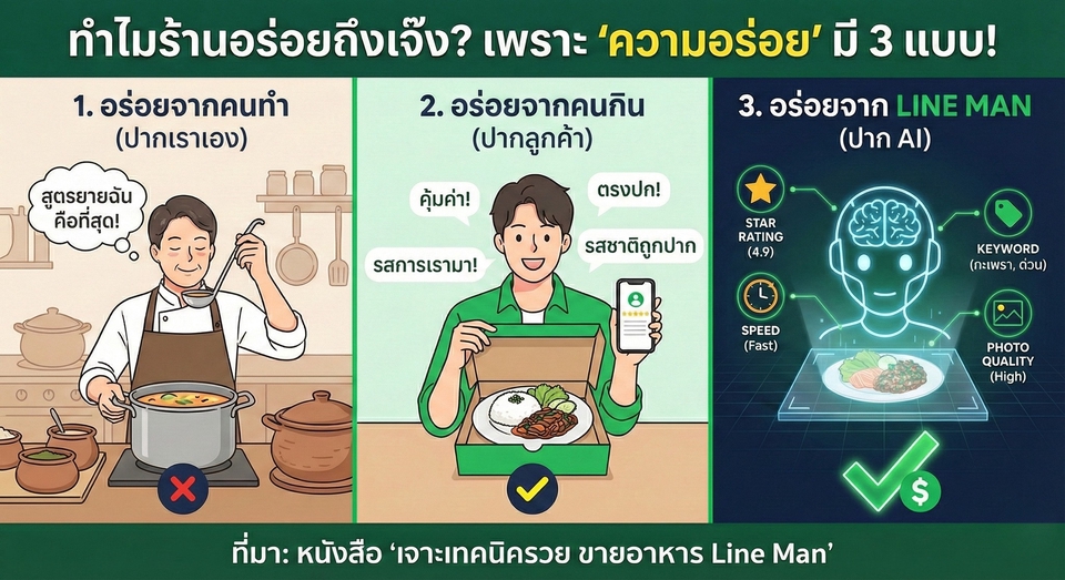 - • เคล็ดลับ "3 ความอร่อย": การจูนรสชาติให้ถูกปากคนทำ, คุ้มค่าคนกิน, และถูกใจ AI ของ LINE MAN